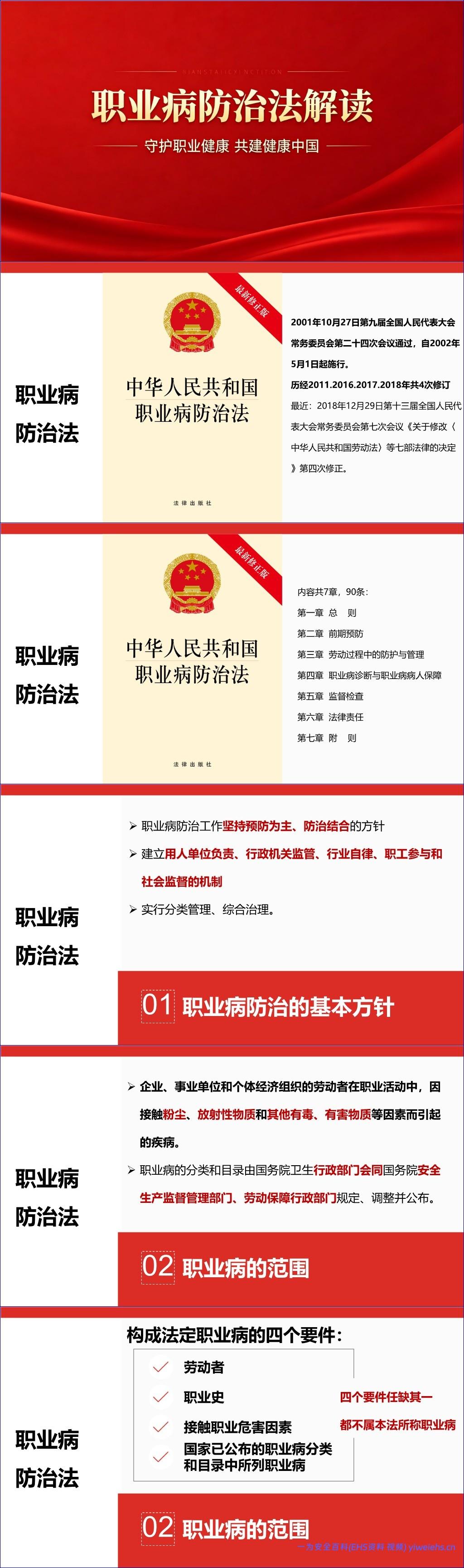 《职业病防治法解读》文档全面阐述了《中华人民共和国职业病防治法》的核心内容、实施要点及相关配套法规。该法于2001年通过,自2002年5月1日起施行,并历经2011年、2016年、2017年和2018年四次修订,最新修正于2018年12月29日。全文共7章90条,确立了“预防为主、防治结合”的基本方针,并构建了由用人单位负责、行政机关监管、行业自律、职工参与和社会监督的综合机制,实行分类管理和综合治理。