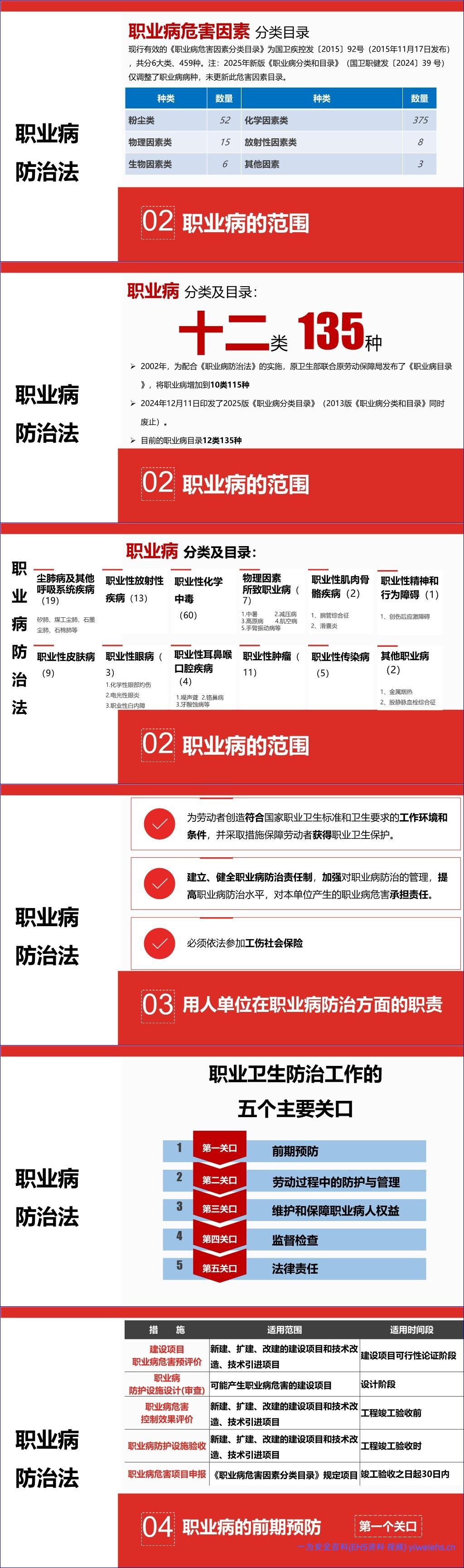 文档首先界定了职业病的范围,即企业、事业单位和个体经济组织的劳动者在职业活动中,因接触粉尘、放射性物质及其他有毒、有害物质等因素而引起的疾病。构成法定职业病需满足四个要件:劳动者身份、明确的职业史、接触职业危害因素以及所患疾病属于国家公布的《职业病分类和目录》。目前,我国《职业病分类和目录》(2025版)包含12大类135种职业病,涵盖了尘肺病、职业性放射性疾病、化学中毒、物理因素所致疾病、肿瘤、皮肤病等多种类型。同时,《职业病危害因素分类目录》列出了6大类共459种危害因素。