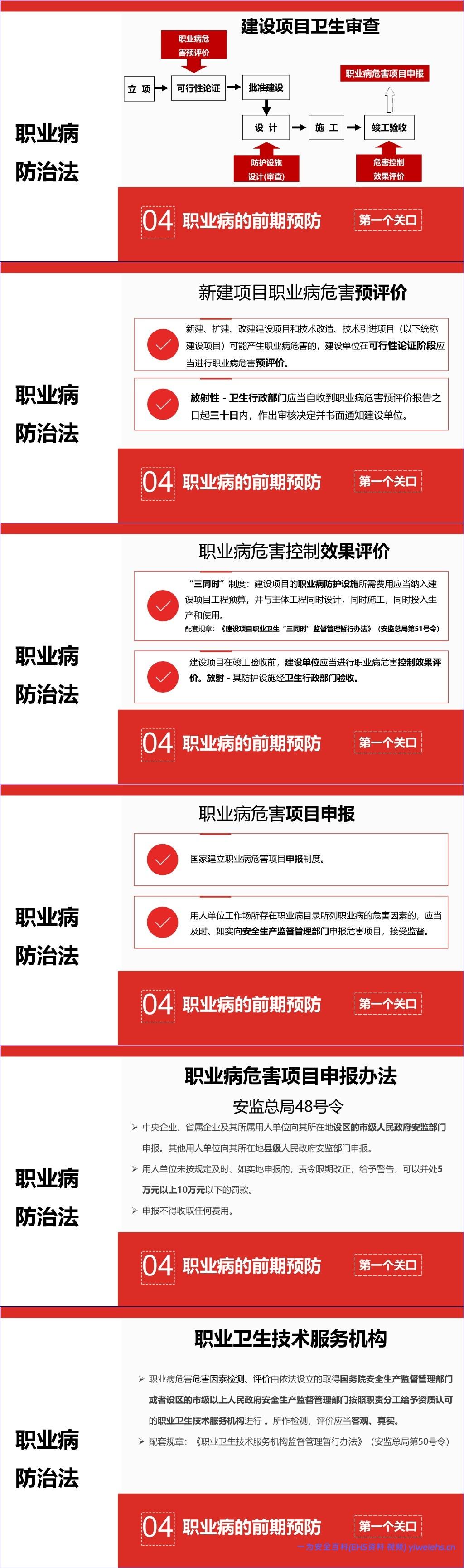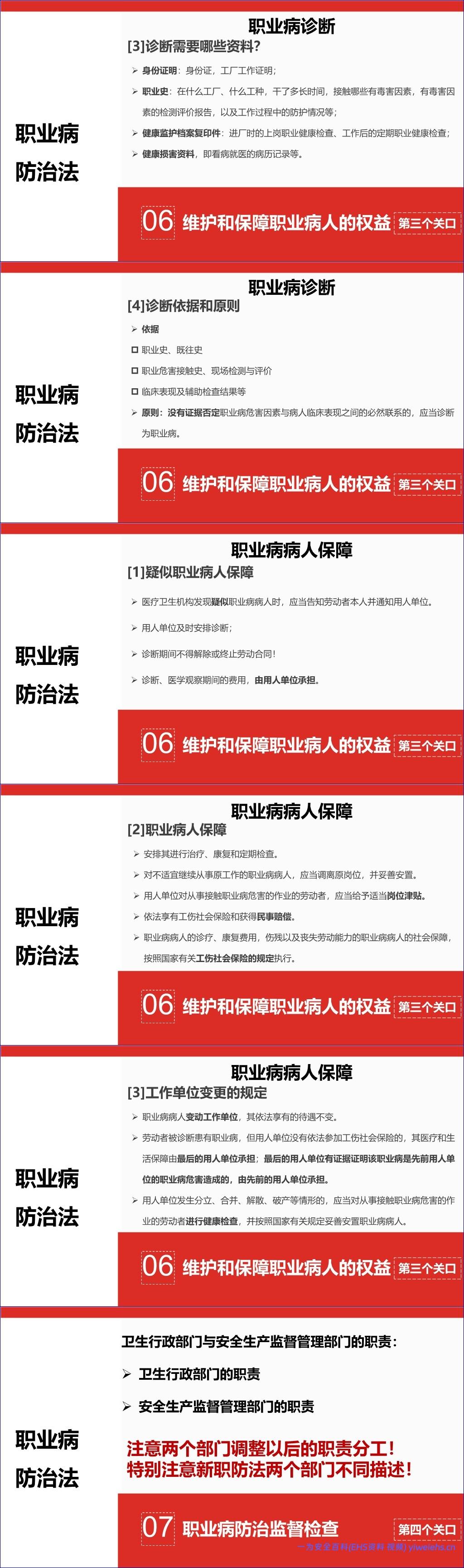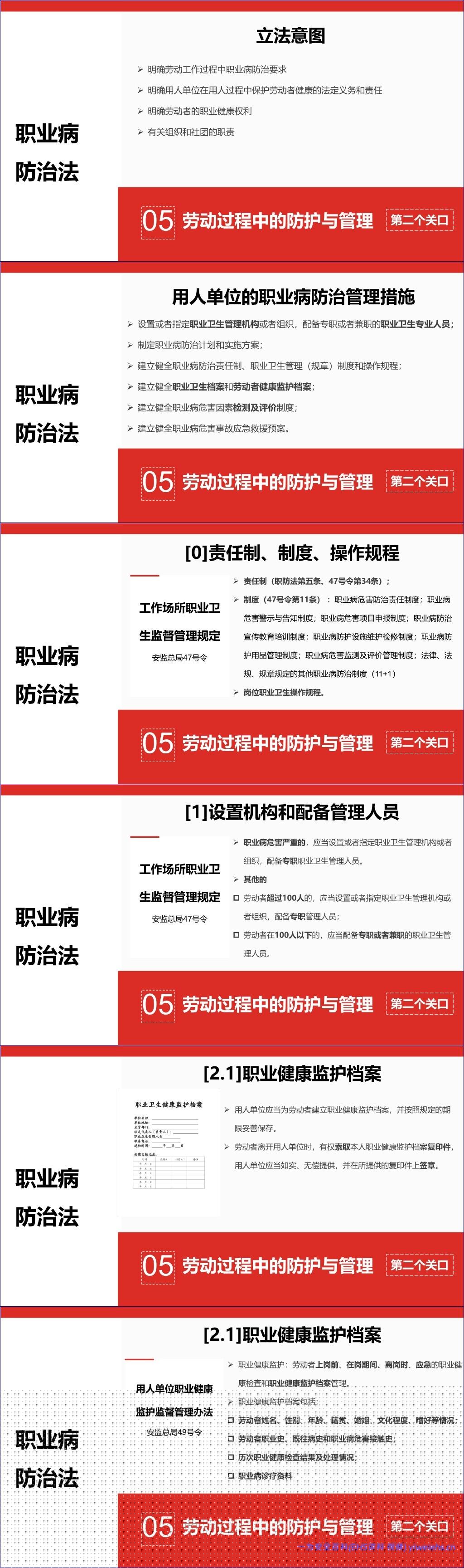 文档重点强调了用人单位在职业病防治中的主体责任,包括为劳动者创造符合国家职业卫生标准的工作环境、建立健全职业病防治责任制、依法参加工伤社会保险等。围绕职业病防治工作的五个主要关口,文档进行了详细解读: