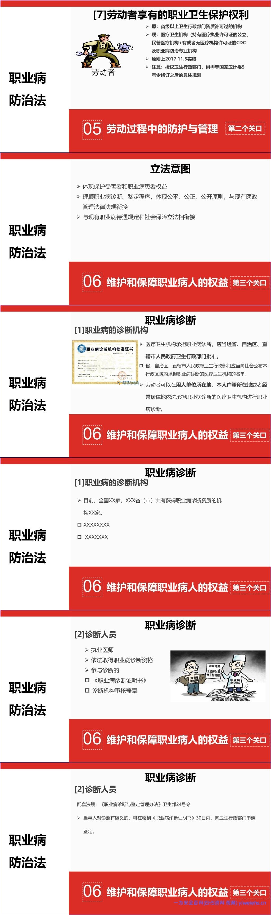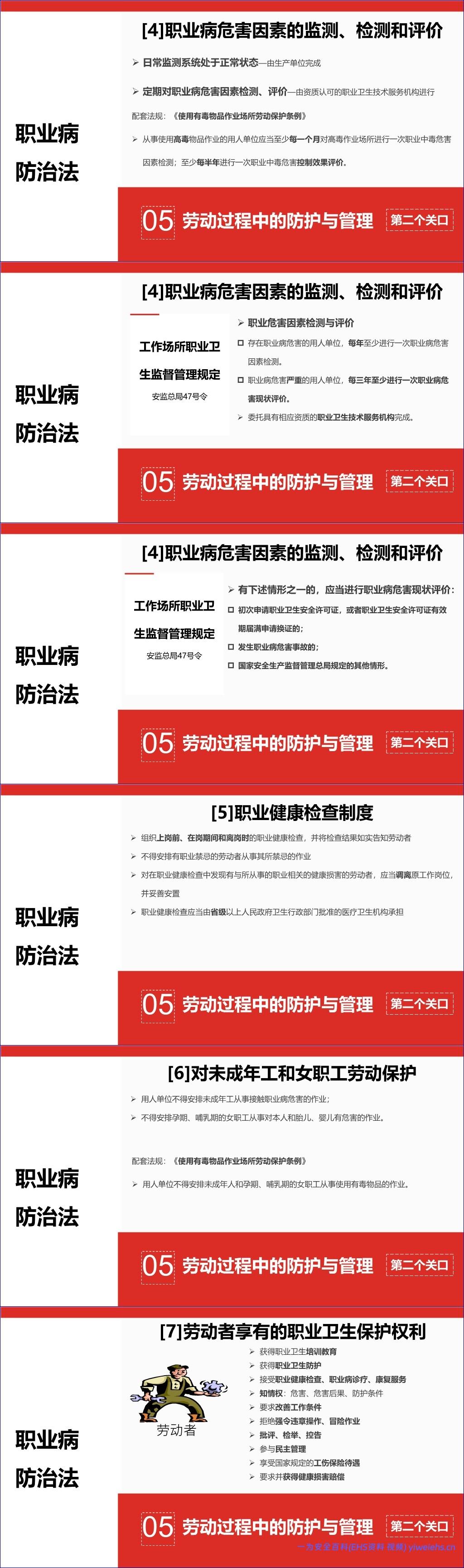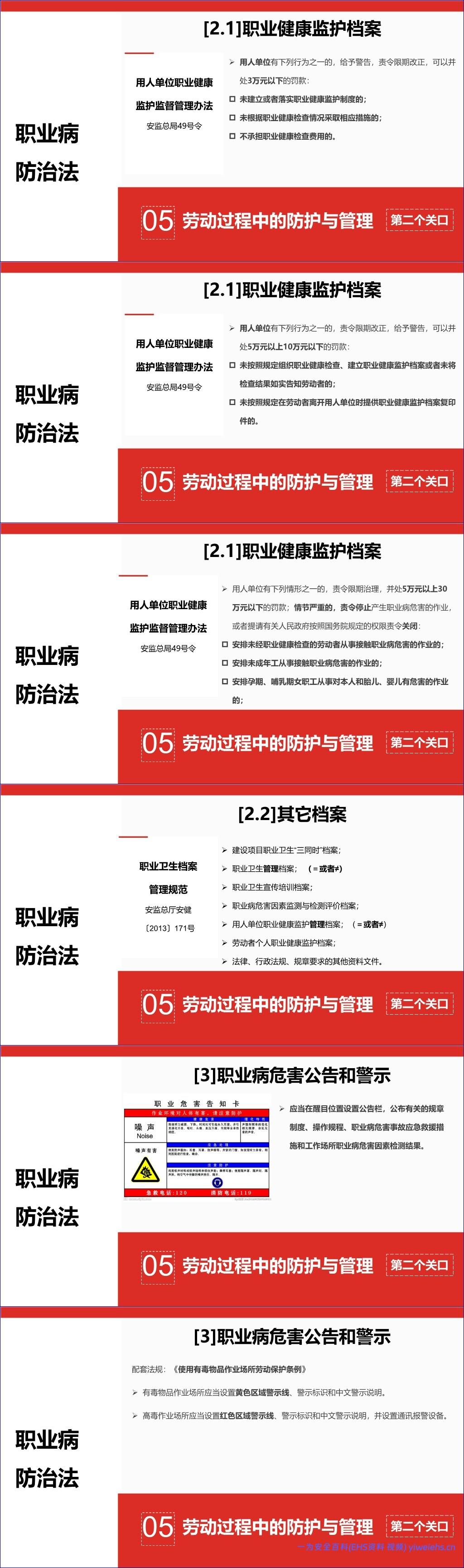 文档重点强调了用人单位在职业病防治中的主体责任,包括为劳动者创造符合国家职业卫生标准的工作环境、建立健全职业病防治责任制、依法参加工伤社会保险等。围绕职业病防治工作的五个主要关口,文档进行了详细解读: