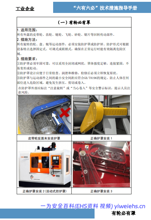 该文档《工业企业“六有六必”技术措施指导图册》由张家港市应急管理局发布,旨在通过六项核心安全技术措施,系统性防范工业生产中的机械伤害、高处坠落等风险。全文围绕“六有六必”原则展开,每一项均明确了适用范围、具体措施方法及详细的技术要求。