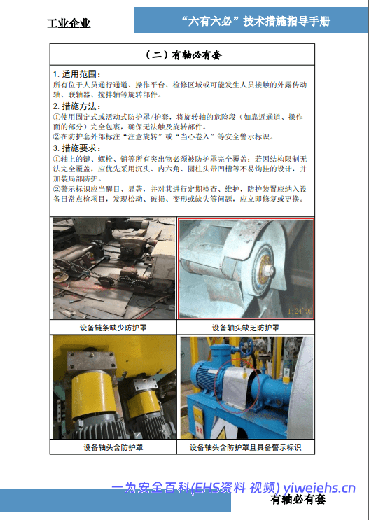 (二)有轴必有套:对于位于人员活动区域的外露传动轴、联轴器等,必须使用防护套将其完全包裹。若因结构限制无法全覆盖,则需采用不易钩挂的设计并加装局部防护,同时设置醒目的安全警示标识,并纳入日常点检。