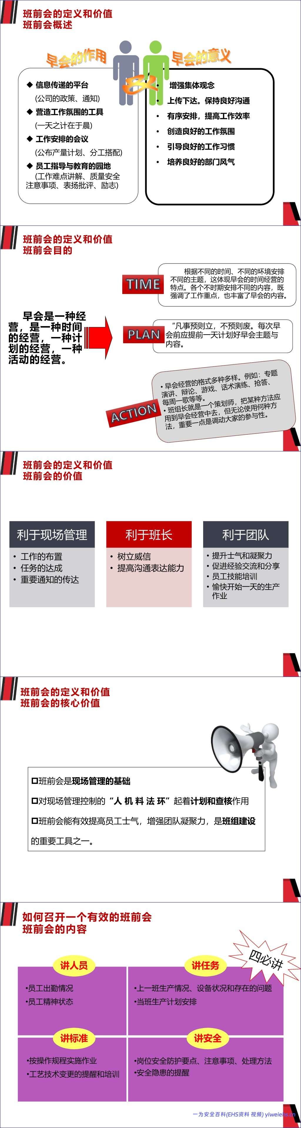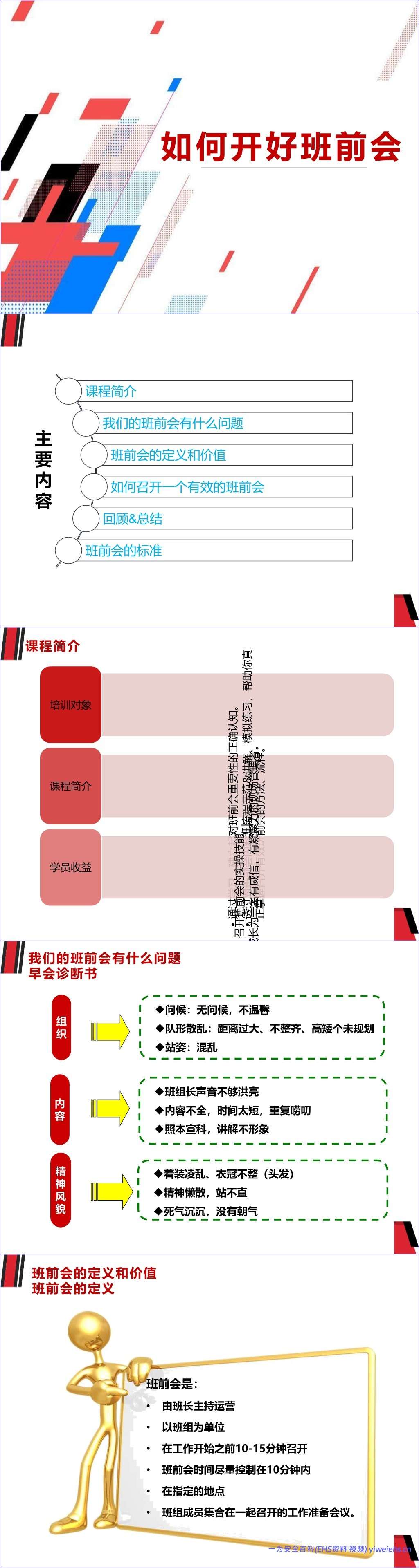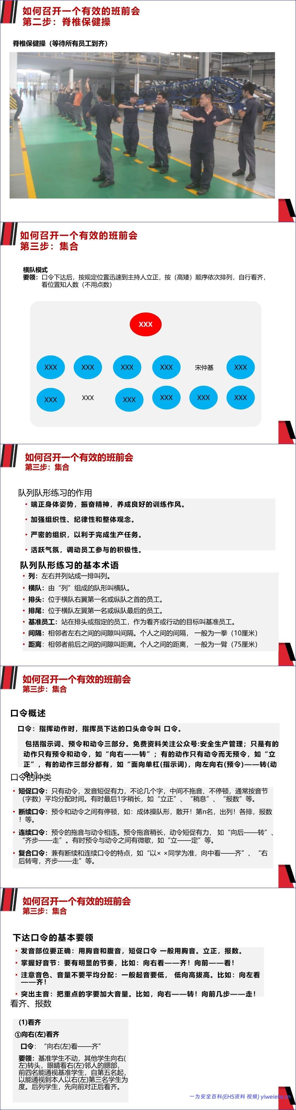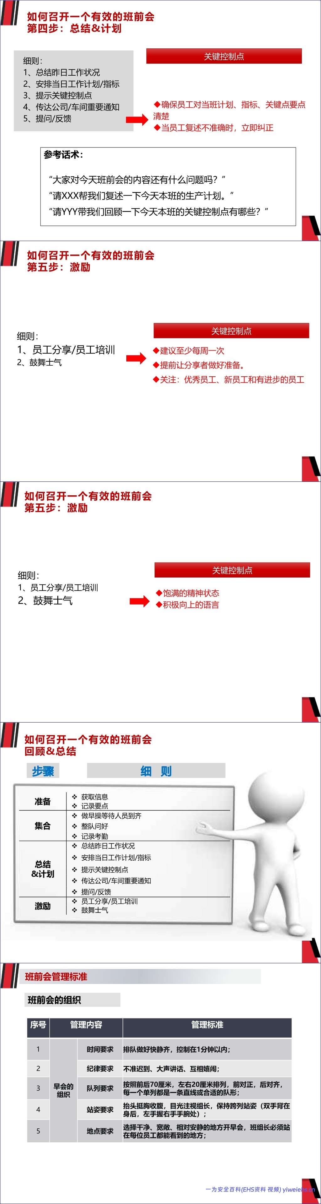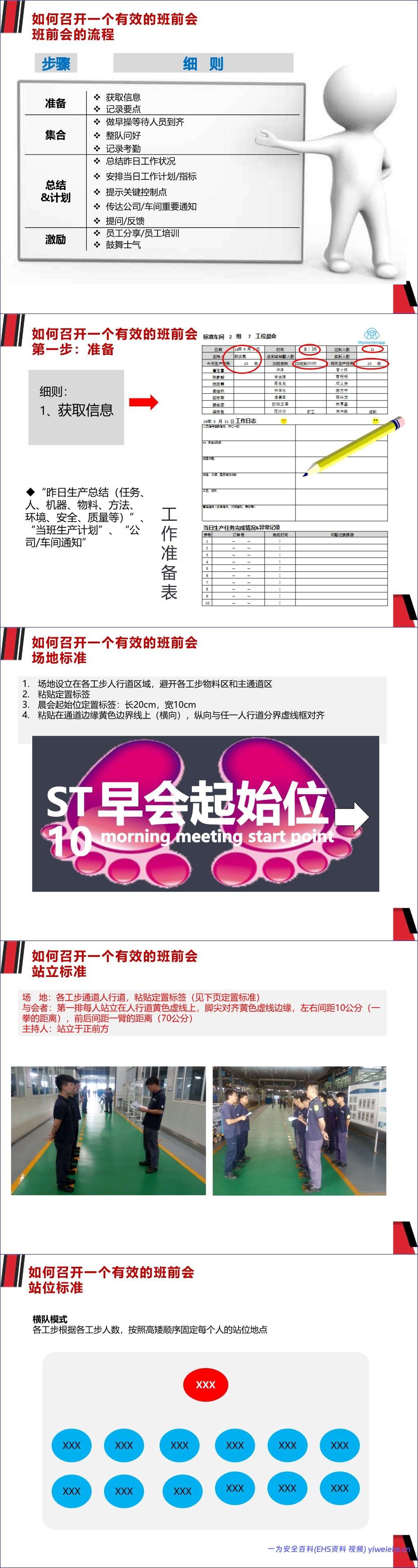 为解决上述问题,文档提供了一套标准化的班前会流程,分为五个步骤: