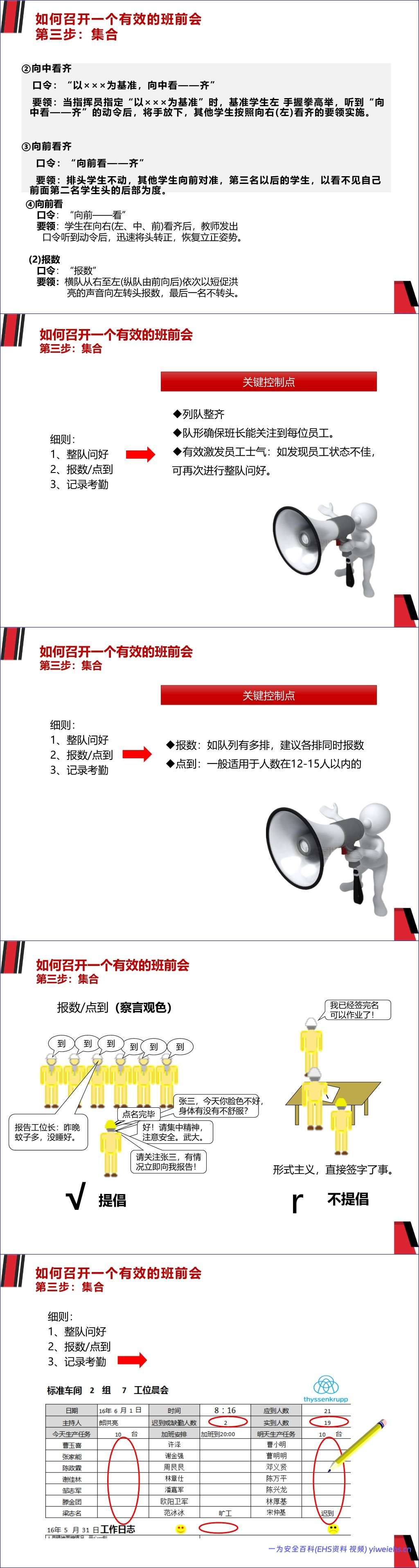 集合:在指定场地整队,通过做操、问好、报数/点名来检查出勤并观察员工状态,记录考勤。