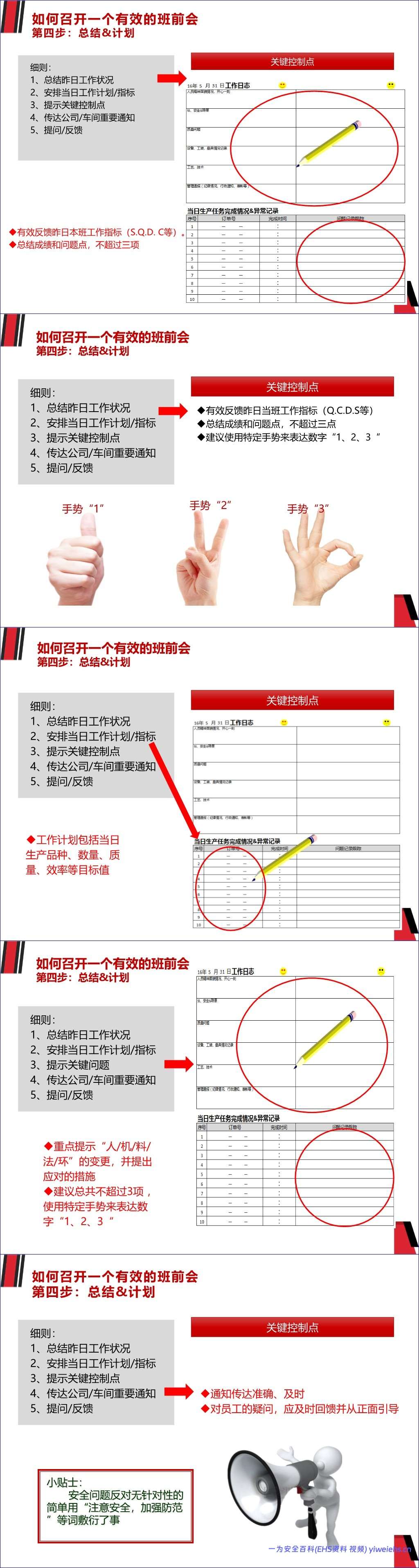 总结与计划:回顾昨日工作(成绩与不超过三点的问题),明确当日任务目标,并重点提示“人、机、料、法、环”中的关键控制点和安全事项,确保信息传达准确无误。