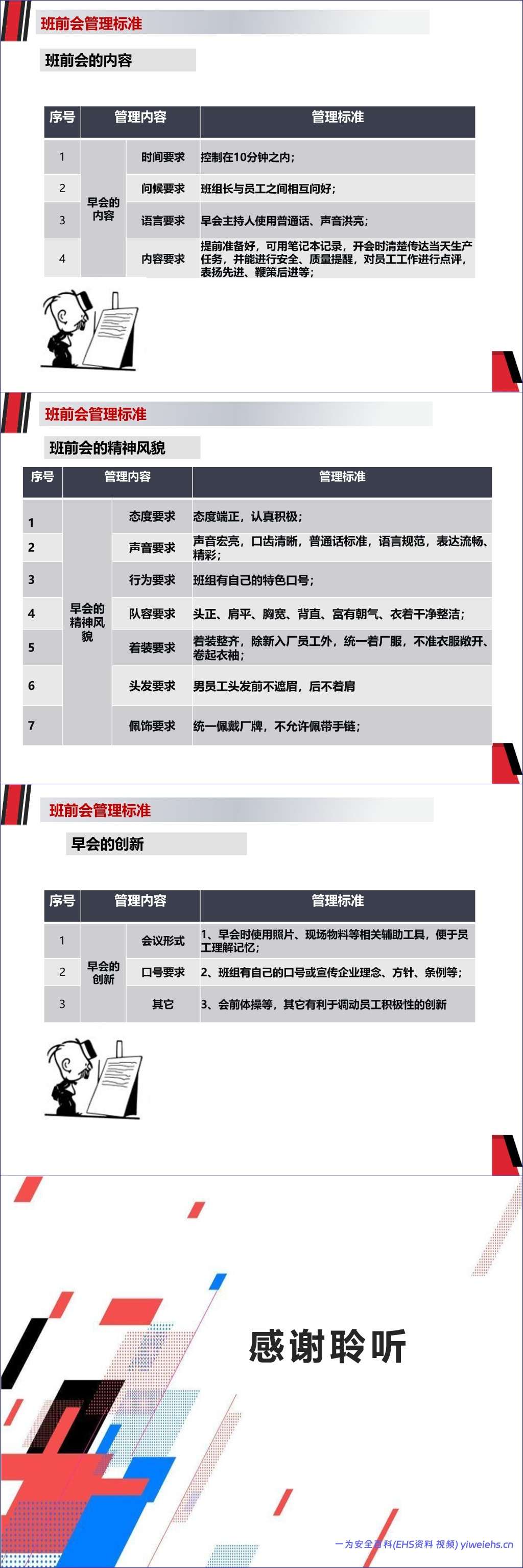 此外,文档还制定了详细的管理标准,涵盖了班前会的组织(时间、纪律、队列、站姿、地点)、内容(时长、问候、语言、内容完整性)以及参会人员的精神风貌(态度、声音、着装、仪容)等方面,力求将班前会打造成一个高效、有序、充满活力的管理工具。