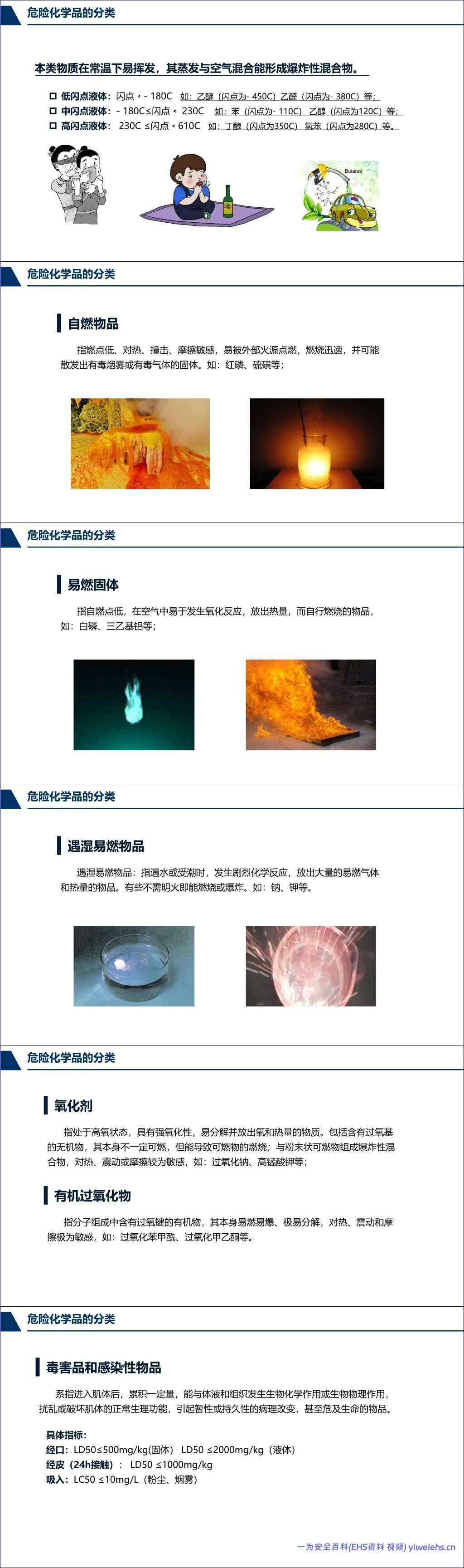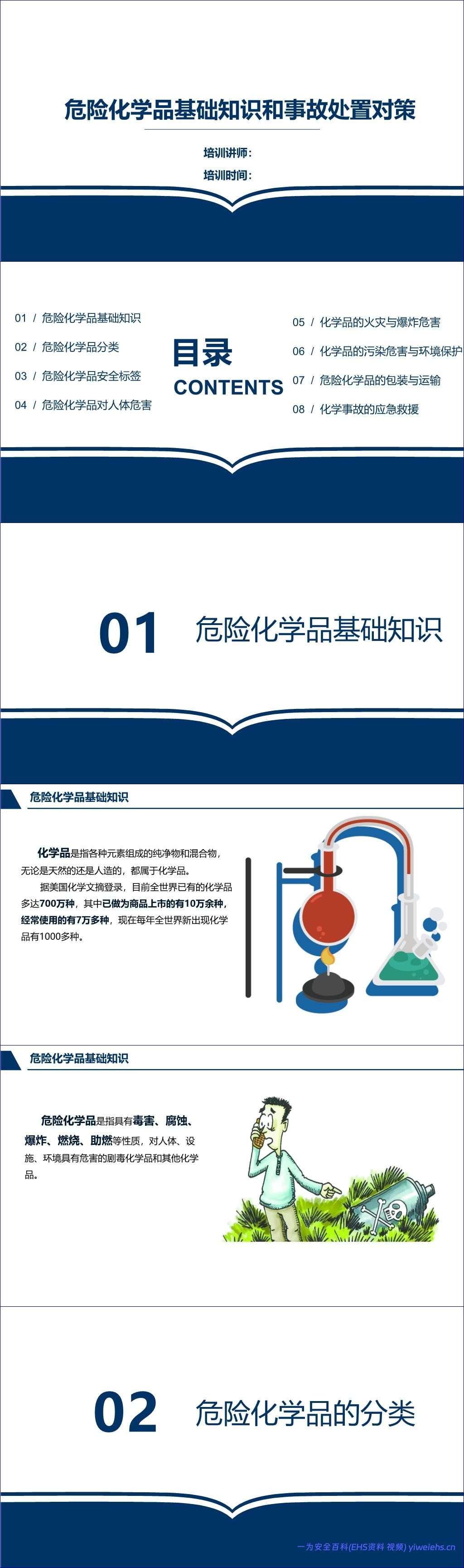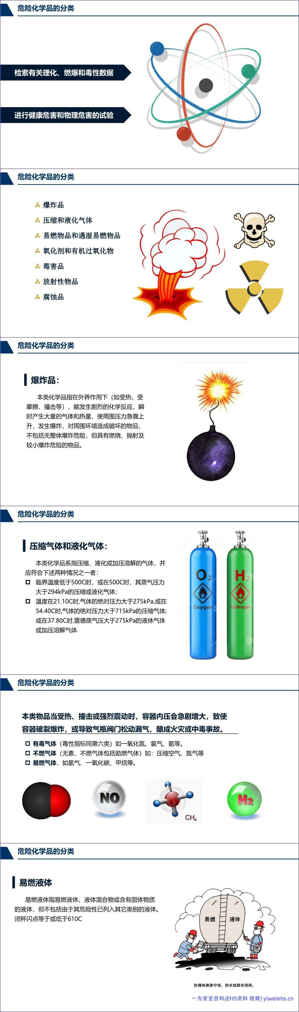 该文档《危险化学品基础知识和事故处置对策》全面系统地介绍了危险化学品的相关知识及事故应对措施。首先,文档定义了危险化学品,即具有毒害、腐蚀、爆炸、燃烧、助燃等性质,对人体、设施、环境具有危害的剧毒化学品和其他化学品。接着,详细阐述了危险化学品的分类,包括爆炸品、压缩和液化气体、易燃液体、易燃固体、自燃物品、遇湿易燃物品、氧化剂和有机过氧化物、毒害品、放射性物品以及腐蚀品,并对各类别的特性、代表物质及危险性进行了说明。