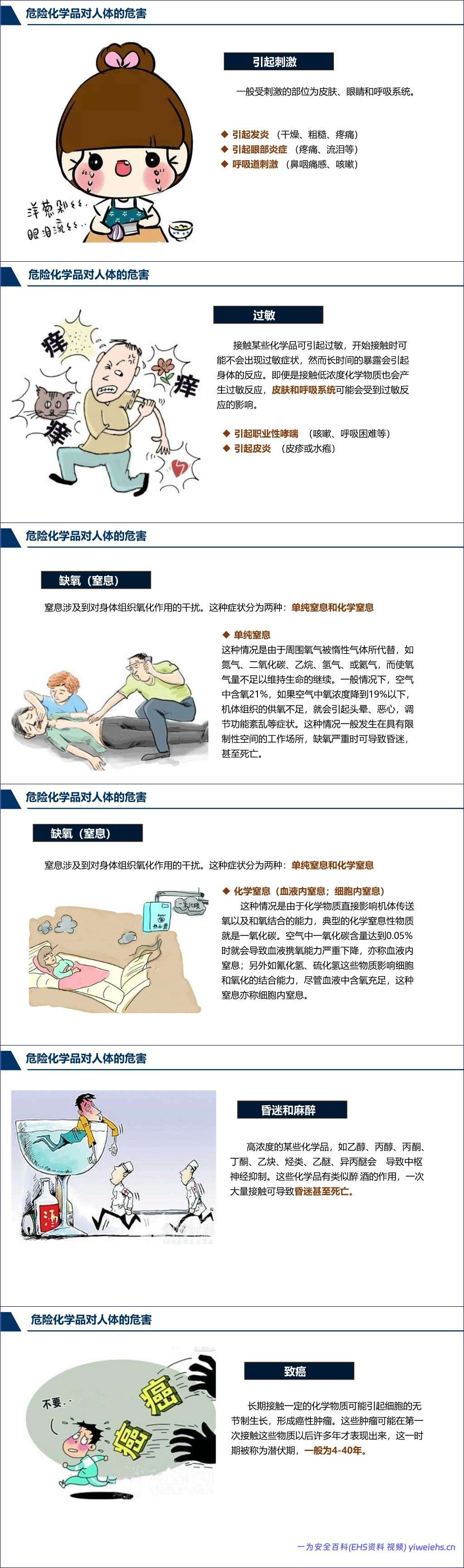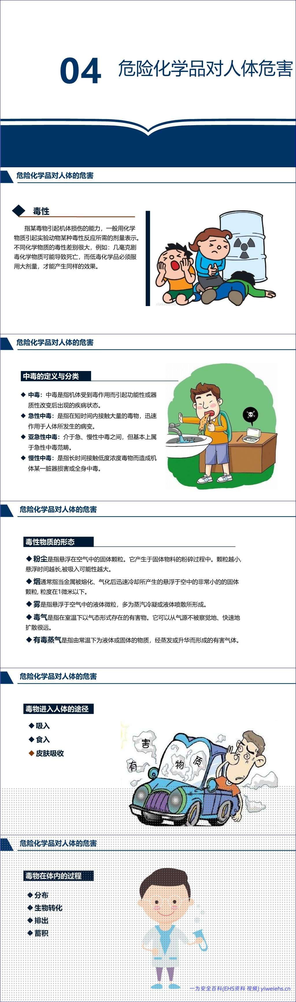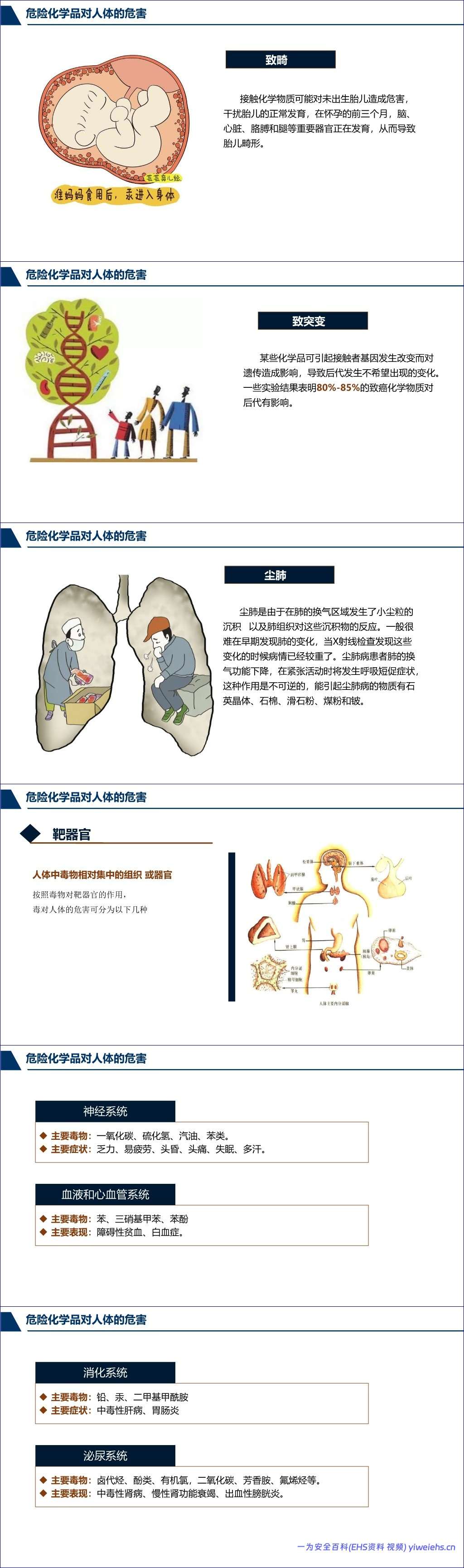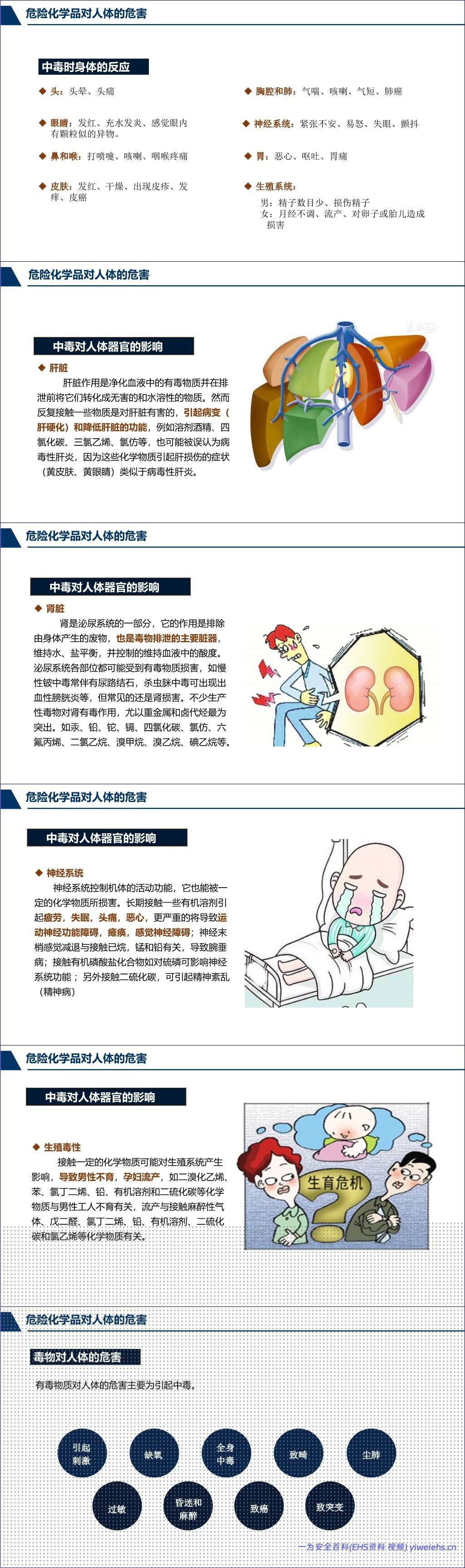 在对人体的危害方面,文档深入剖析了危险化学品对人体危害的多种途径(吸入、食入、皮肤吸收)和形式,包括急性、亚急性和慢性中毒。具体危害涵盖刺激、过敏、缺氧(窒息)、昏迷和麻醉、致癌、致畸、致突变、尘肺等,并详细说明了毒物对神经系统、血液系统、消化系统、泌尿系统、生殖系统、皮肤、眼睛等靶器官的损害。