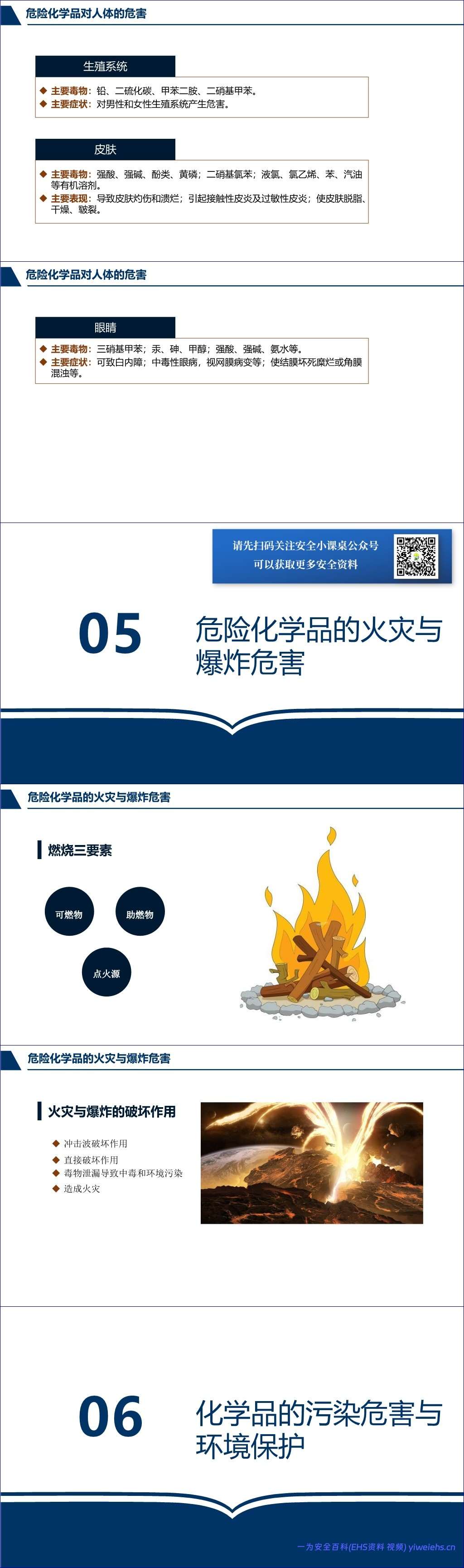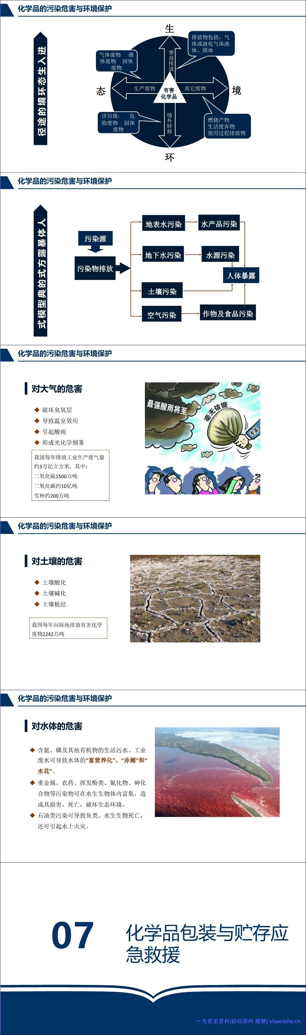 针对火灾与爆炸风险,文档解释了燃烧三要素,并分析了危险化学品火灾的破坏作用,如冲击波、直接破坏、毒物泄漏和次生火灾。此外,文档还论述了化学品对生态环境的污染危害,包括对大气(臭氧层破坏、温室效应、酸雨)、土壤(酸化、碱化)和水体(富营养化、生物富集、石油污染)的影响。