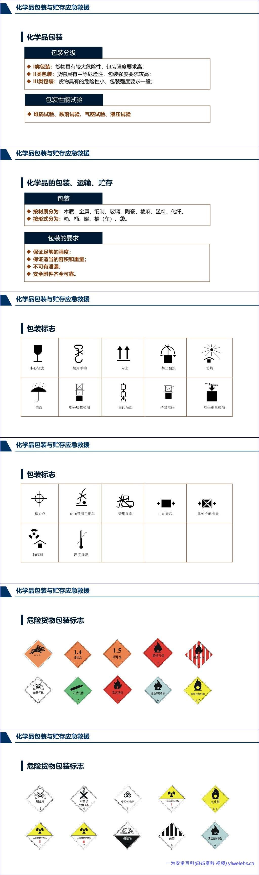在管理环节,文档规范了危险化学品的包装与运输要求,包括包装分级、材质、性能试验、标志以及运输过程中的“四防”、“五定”原则,并提出了贮存场所的安全技术要求。