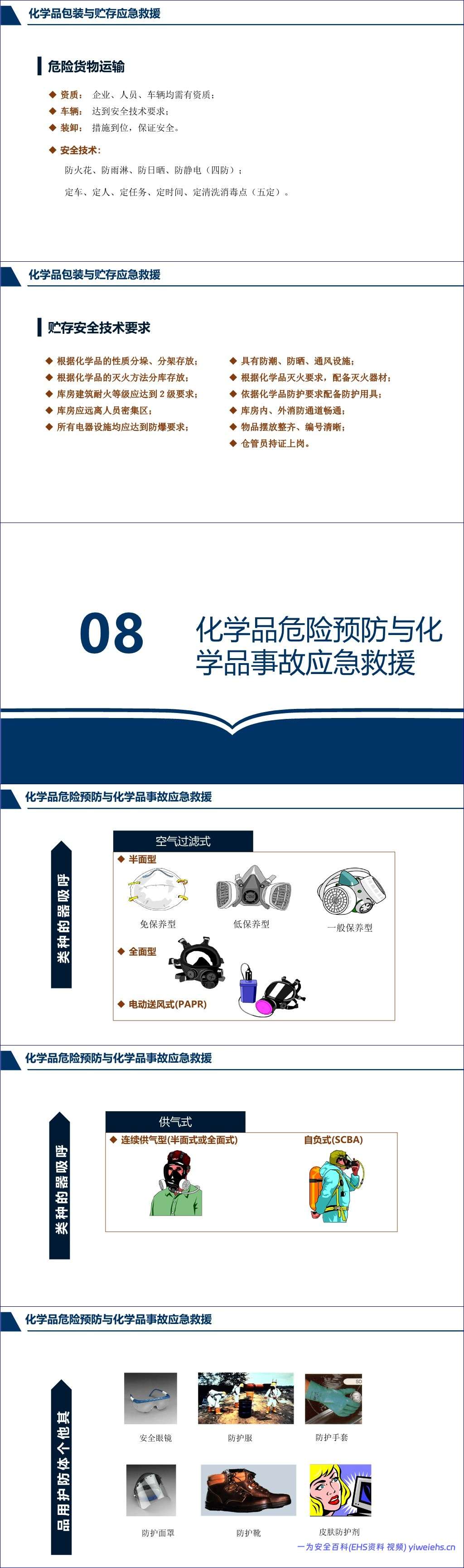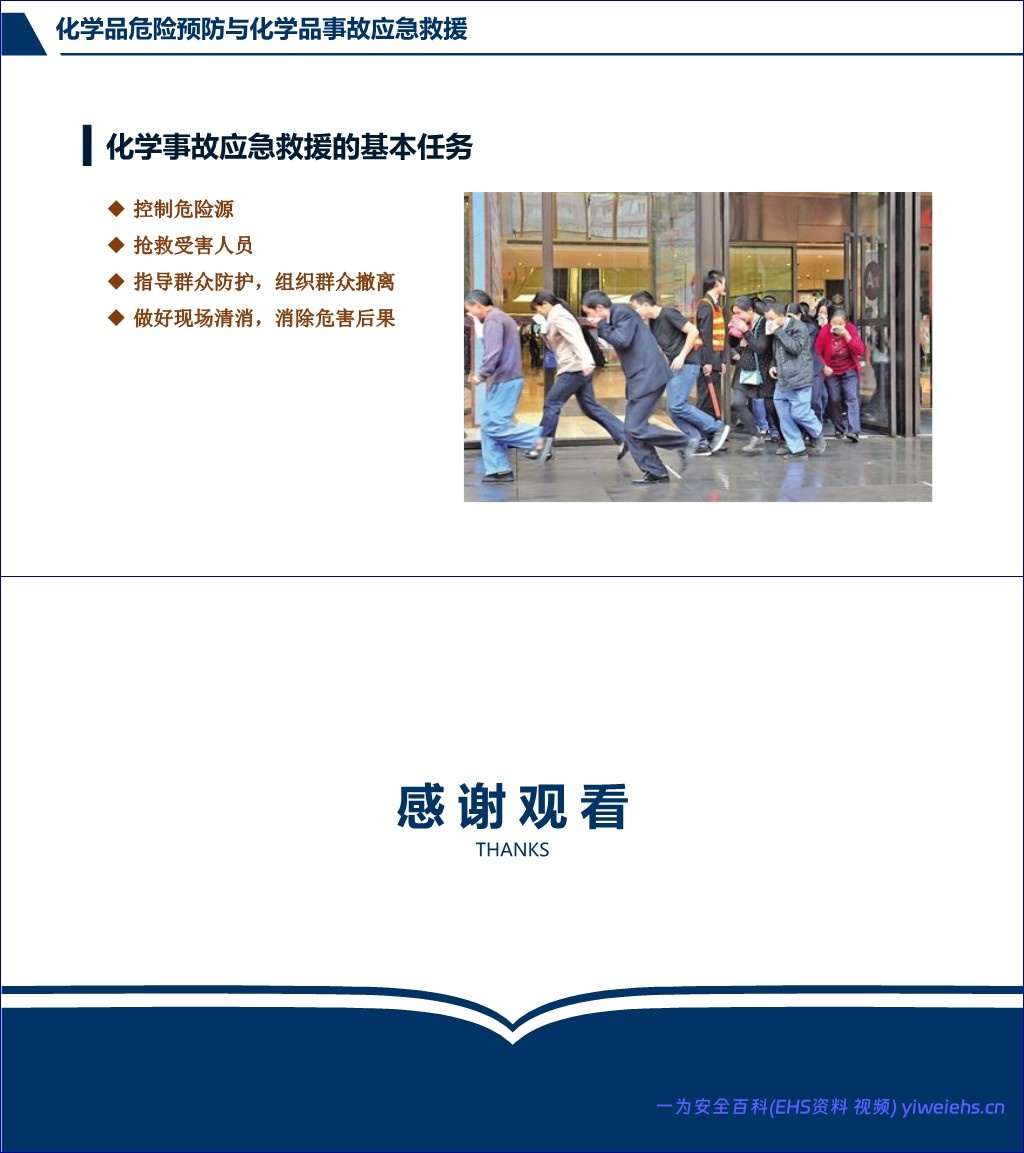 最后,文档重点介绍了化学事故的应急救援,明确了控制危险源、抢救受害人员、指导群众防护撤离、现场清消等基本任务,并列举了包括呼吸器、防护服、手套等在内的个体防护用品。