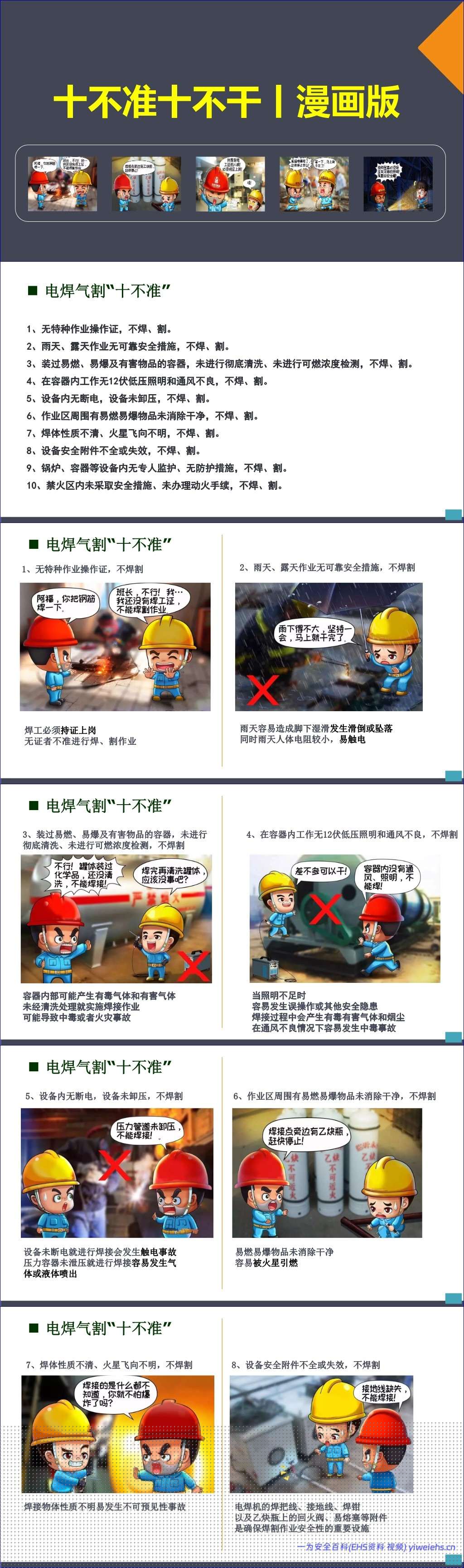 电焊气割“十不准”:强调了进行焊接和切割作业前的必要条件。核心要求包括操作人员必须持有有效的特种作业操作证;在雨天、露天等恶劣环境下需有可靠安全措施;对装过危险品的容器必须彻底清洗并检测;在密闭空间内工作需保证低压照明和良好通风;设备必须断电、卸压;作业区周围易燃易爆物必须清理干净;对不明性质的焊体不得作业;设备安全附件必须齐全有效;在锅炉、容器等受限空间内作业必须有专人监护;在禁火区内作业必须办理动火手续。