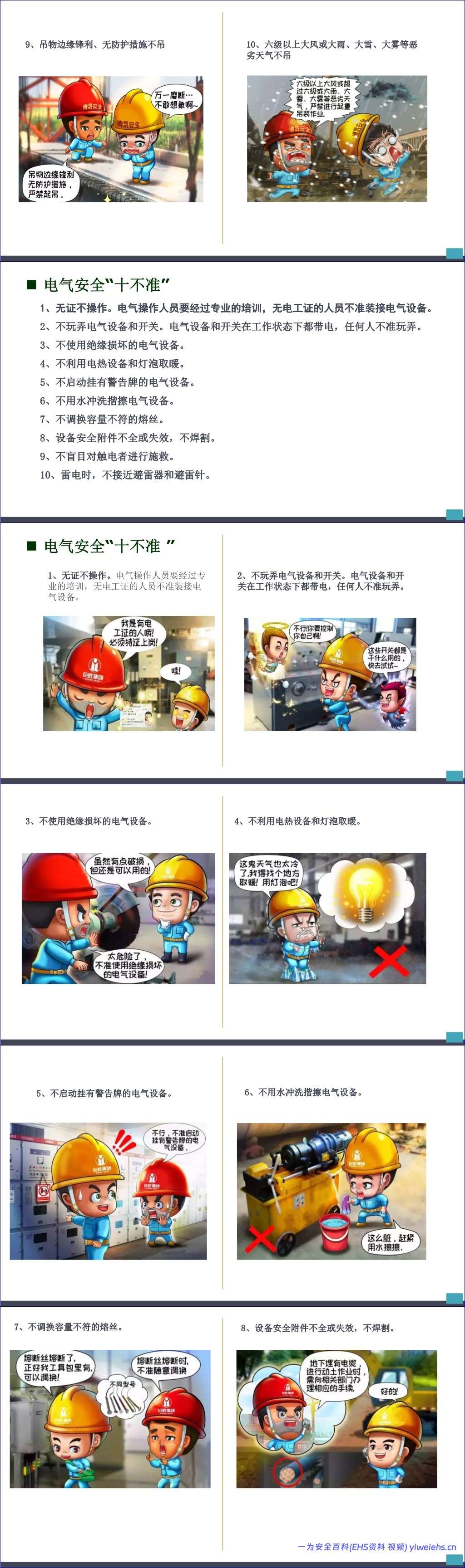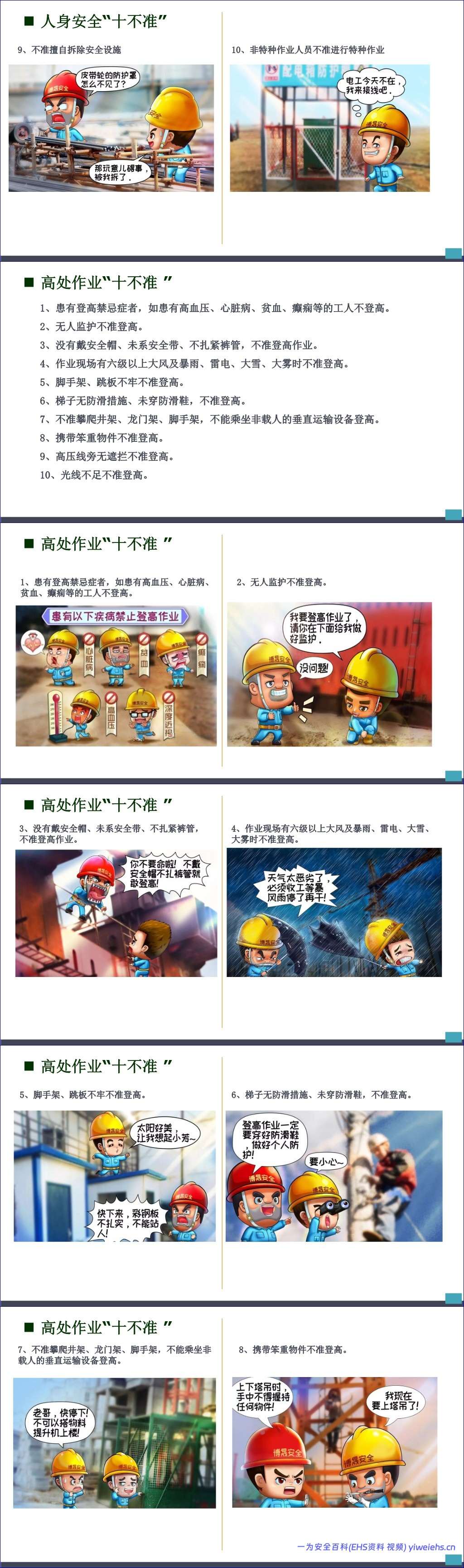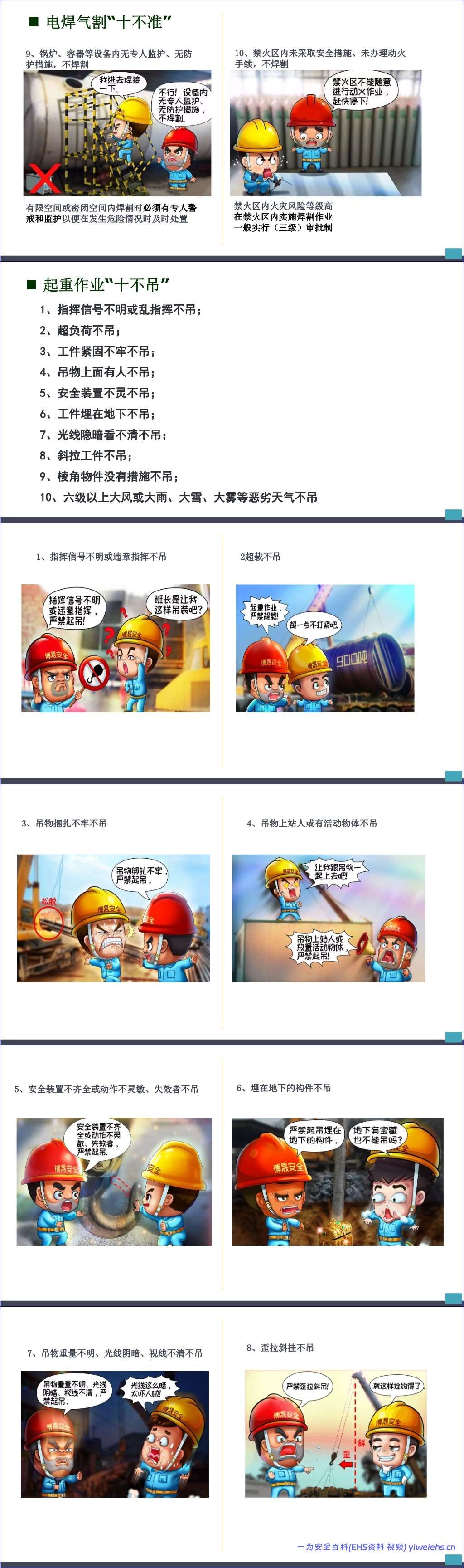 整份文档通过清晰的条目和生动的漫画,全面覆盖了特种作业、起重、用电、施工、人身及高处作业等关键领域的安全红线,是企业进行安全生产教育的重要参考资料。