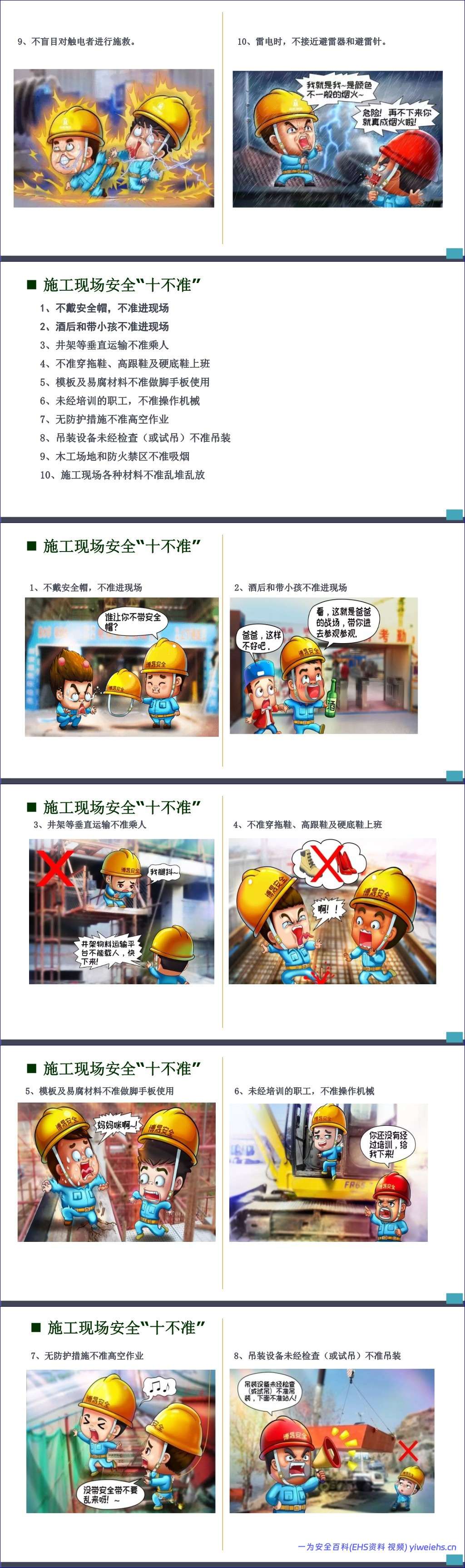 施工现场安全“十不准”:涵盖了进入和在施工现场的基本行为规范。包括进入现场必须佩戴安全帽;严禁酒后上岗和带小孩进入;禁止乘坐垂直运输设备;必须穿着合适的劳保鞋;脚手板材料有严格要求;未经培训不得操作机械;高空作业必须有防护;吊装设备须经检查;防火区域严禁吸烟;现场物料需有序堆放。