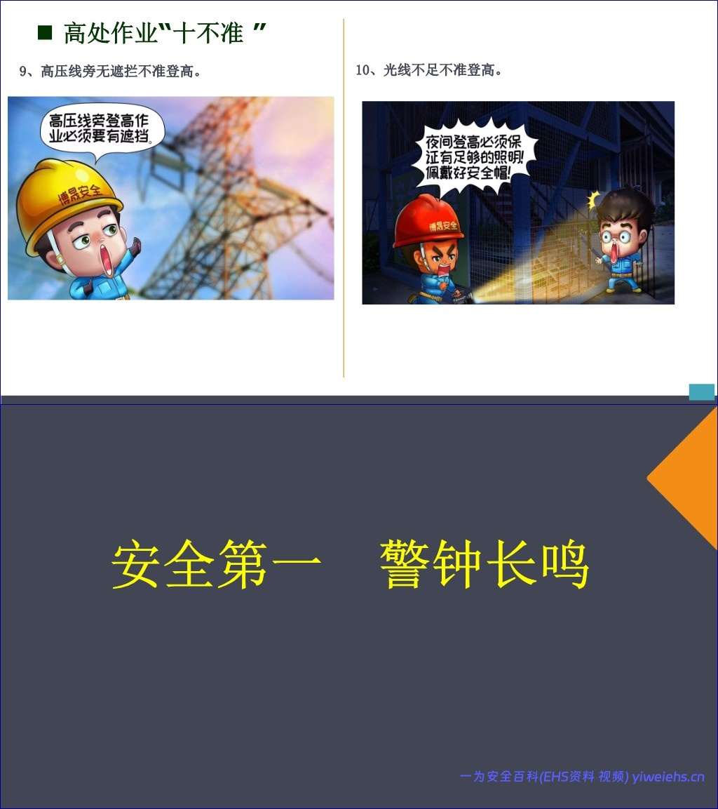 高处作业“十不准”:专门针对登高作业的风险点进行规范。患有高血压、心脏病等禁忌症者不得登高;无人监护不得登高;必须正确佩戴安全帽、系好安全带;遇六级以上大风及暴雨、雷电、大雪、大雾等恶劣天气不得登高;脚手架、梯子等登高设施必须牢固可靠且有防滑措施;不得攀爬非载人设备;不得携带笨重物品;高压线旁无遮挡不得登高;光线不足不得登高。