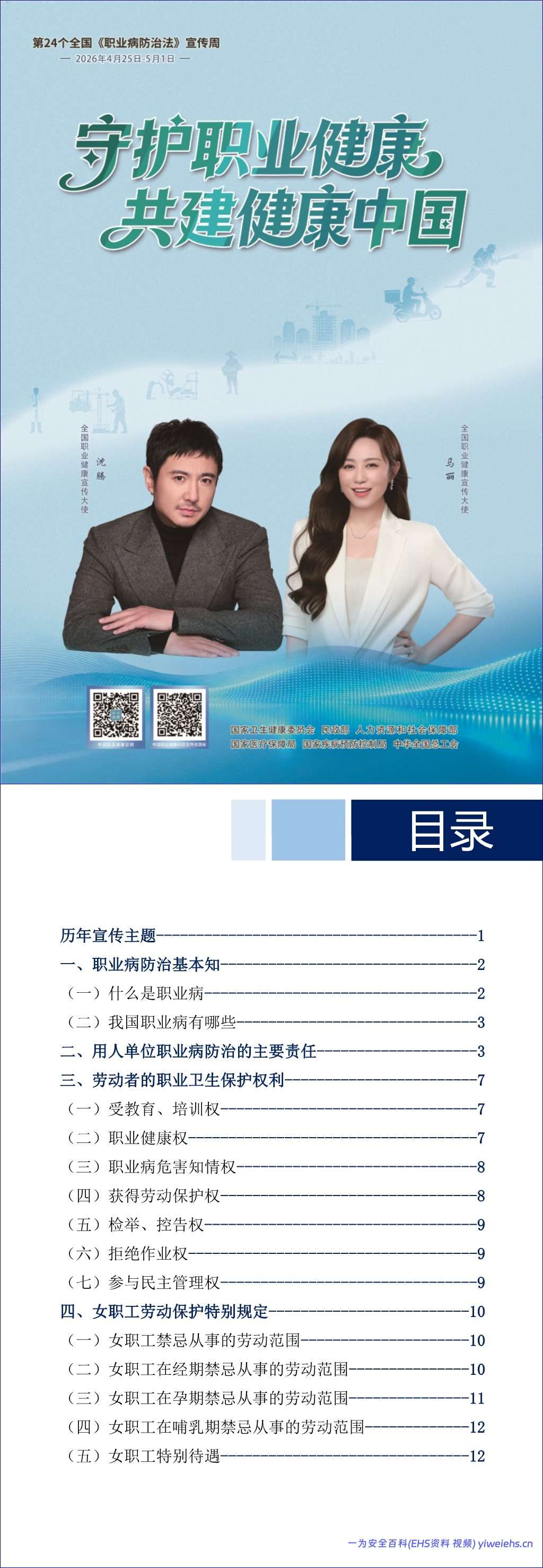 该文档是《2026年〈职业病防治法〉宣传周宣传手册》,旨在全面普及职业病防治知识,提升用人单位和劳动者的法律意识与防护能力。内容以“预防为主,防治结合”为核心原则,系统阐述了职业病防治的各个方面。