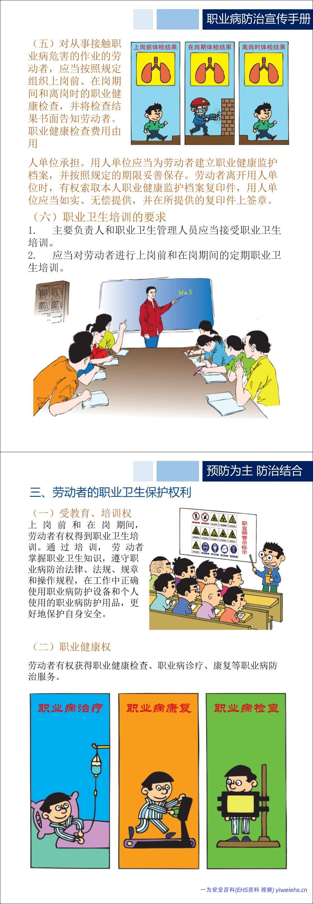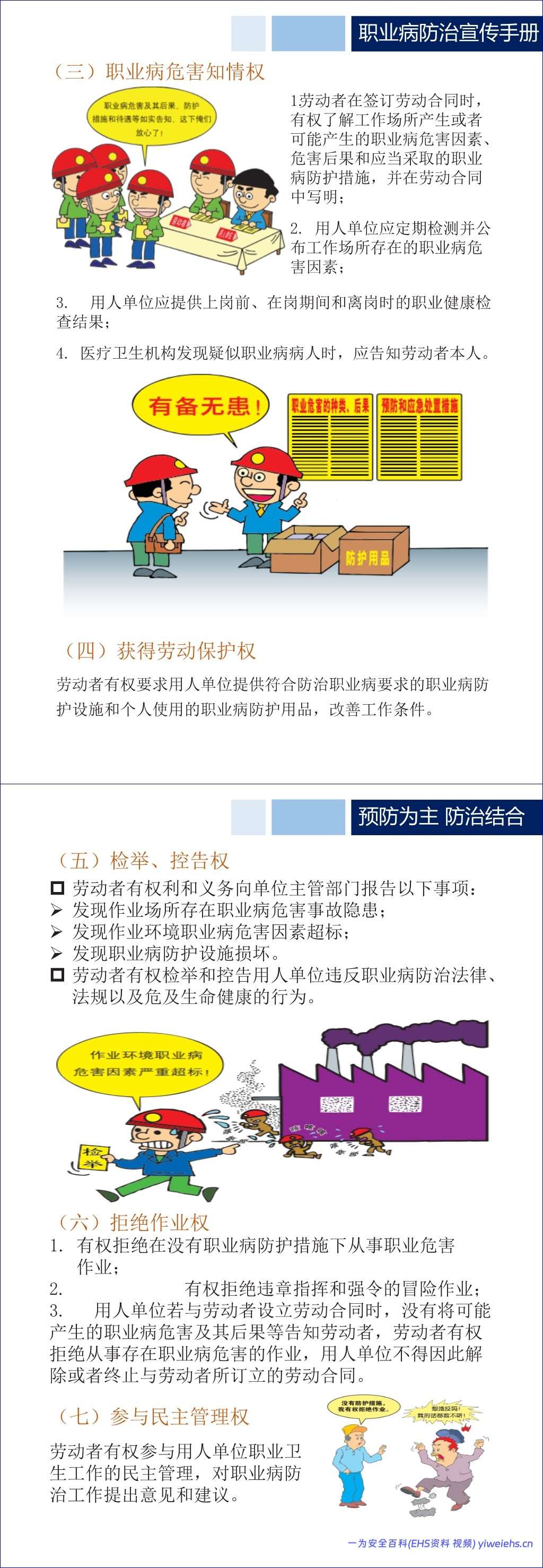 同时,文档着重强调了劳动者依法享有的七项职业卫生保护权利:受教育和培训权、职业健康权、职业病危害知情权、获得劳动保护权、检举控告权、拒绝违章冒险作业权以及参与民主管理权。