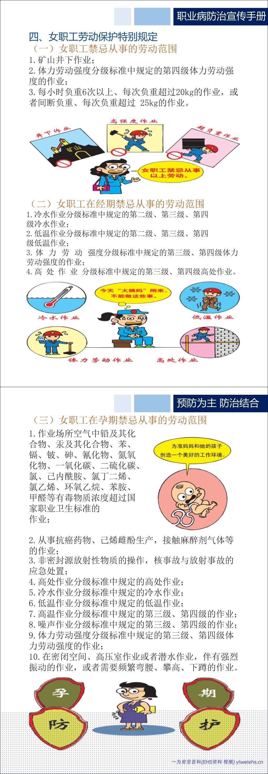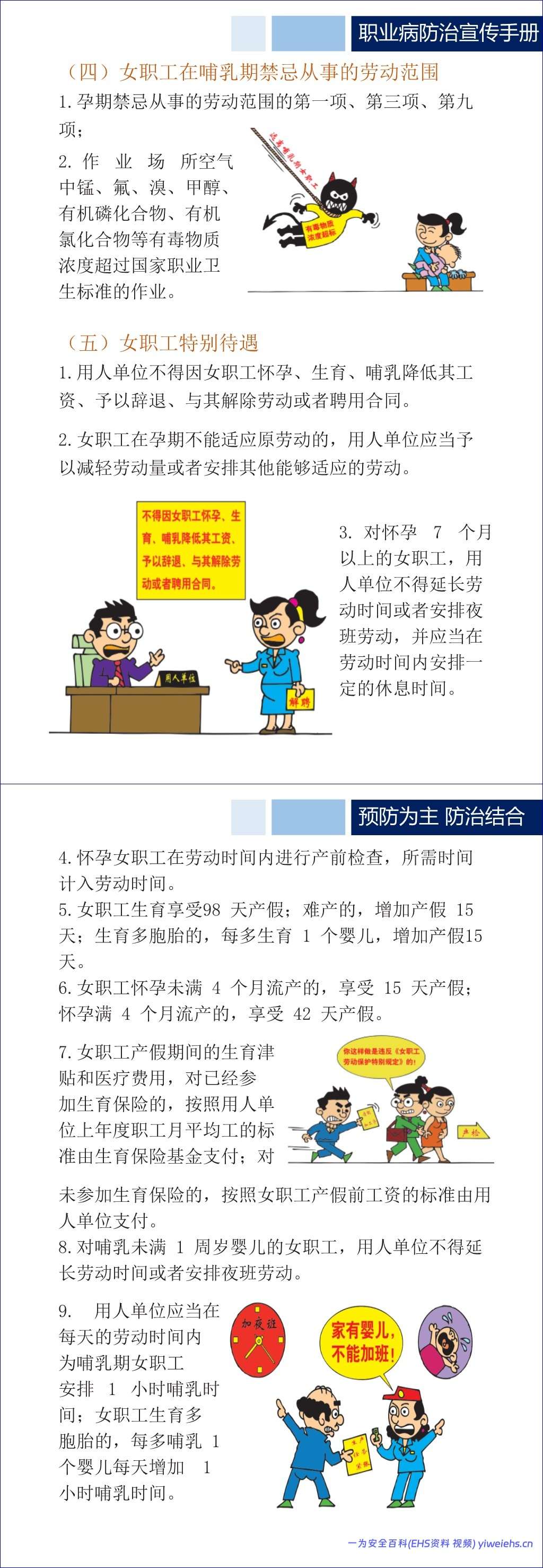 针对特殊群体,文档专门介绍了女职工劳动保护特别规定,详细列出了女职工在经期、孕期、哺乳期禁忌从事的劳动范围,并明确了其在产假、生育津贴、工作安排等方面的特别待遇。