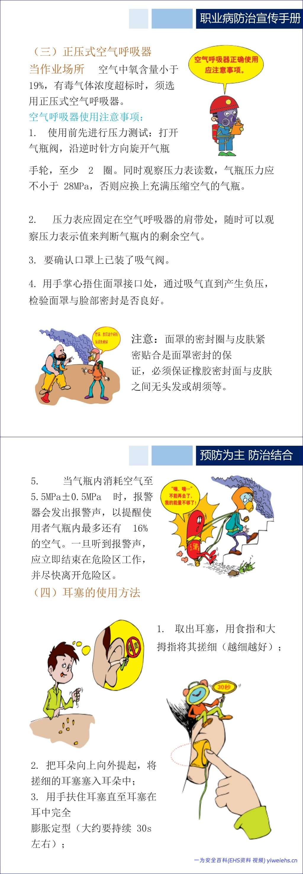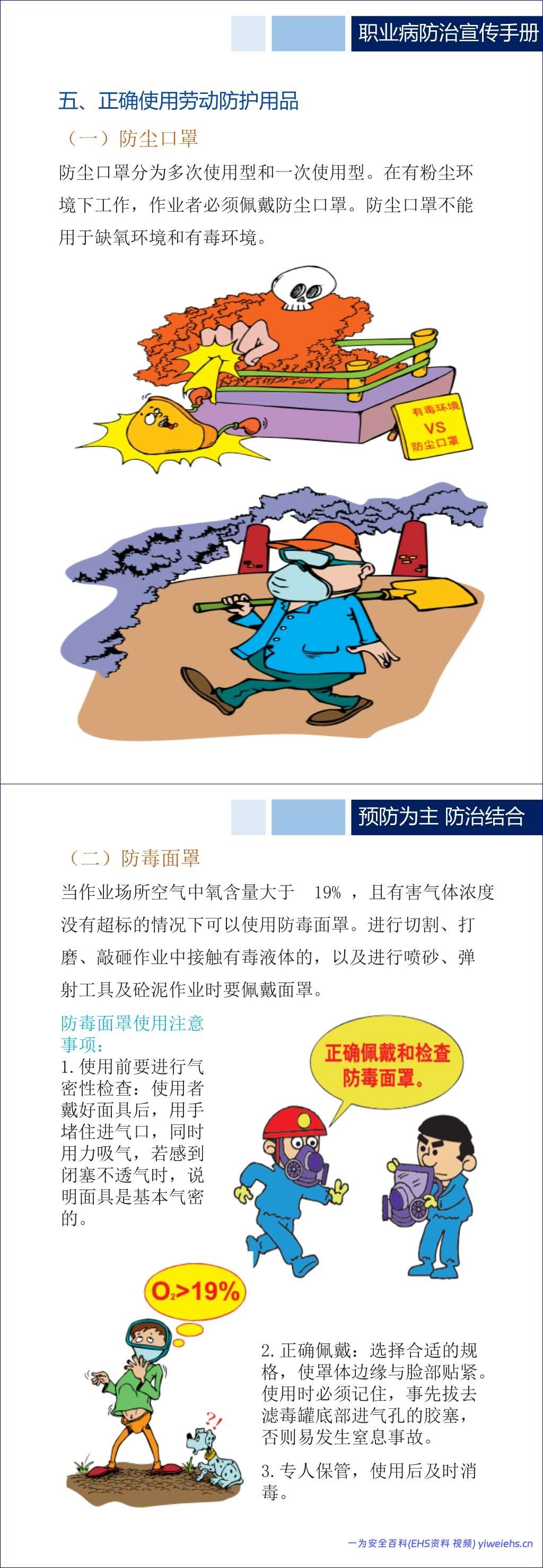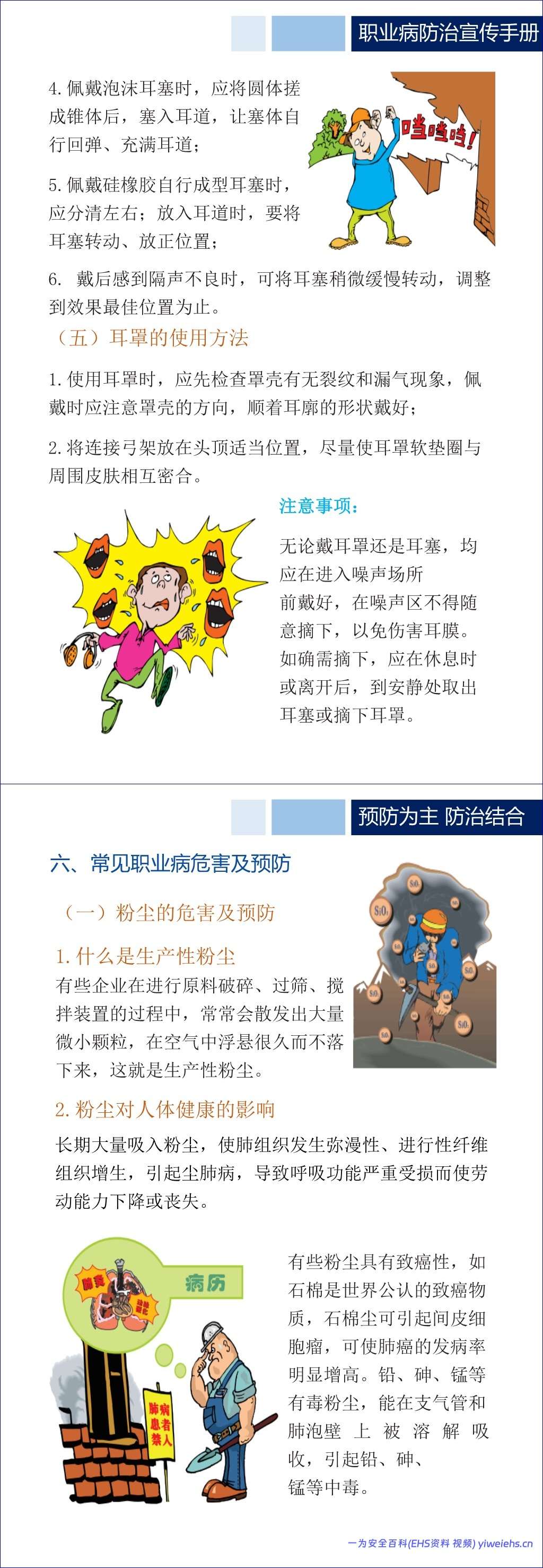 为指导实践,文档提供了劳动防护用品(如防尘口罩、防毒面罩、正压式空气呼吸器、耳塞、耳罩)的正确使用方法,并深入分析了常见职业病危害(如粉尘、化学毒物、放射性物质、高温、噪声、生物因素)的具体危害及预防措施。