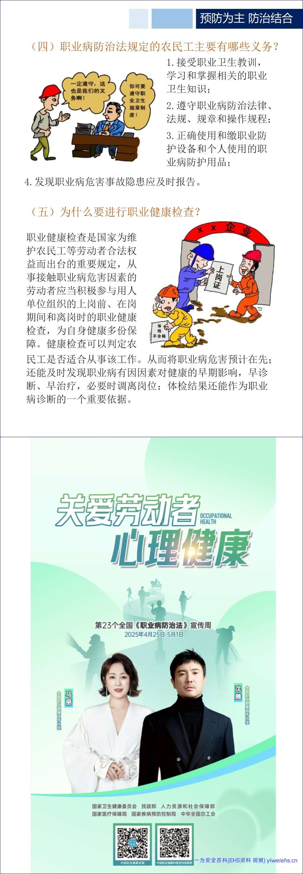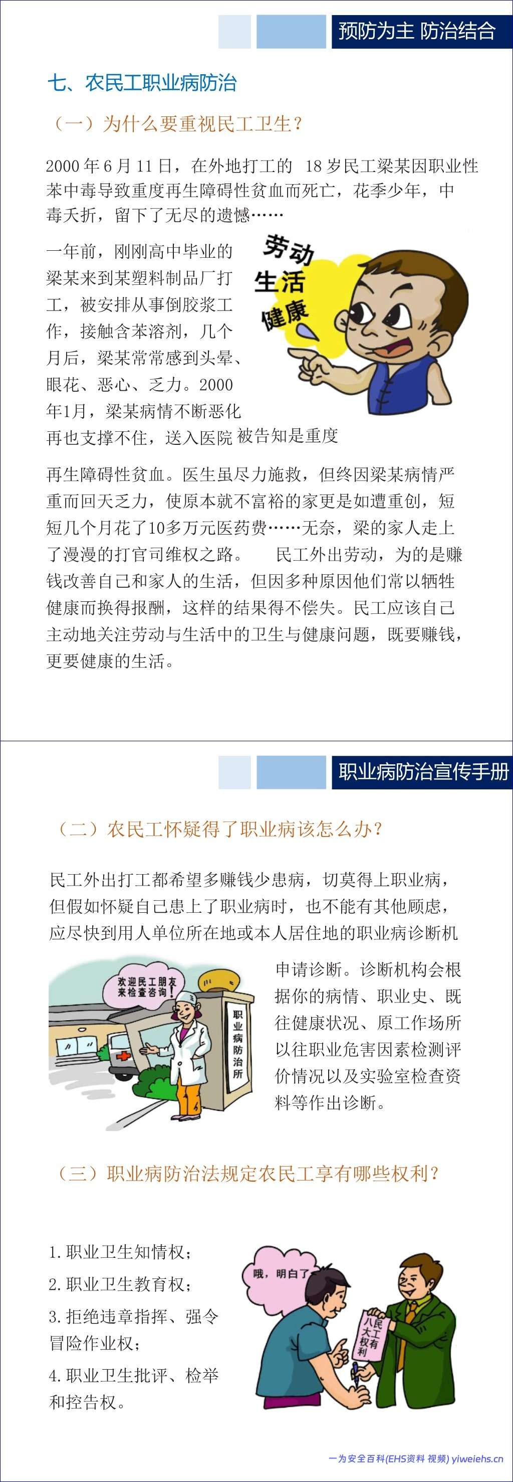 最后,文档特别关注了农民工这一高风险群体,通过真实案例警示其职业健康风险,并阐明了农民工在职业病防治中享有的权利、应尽的义务,以及进行职业健康检查的重要性。