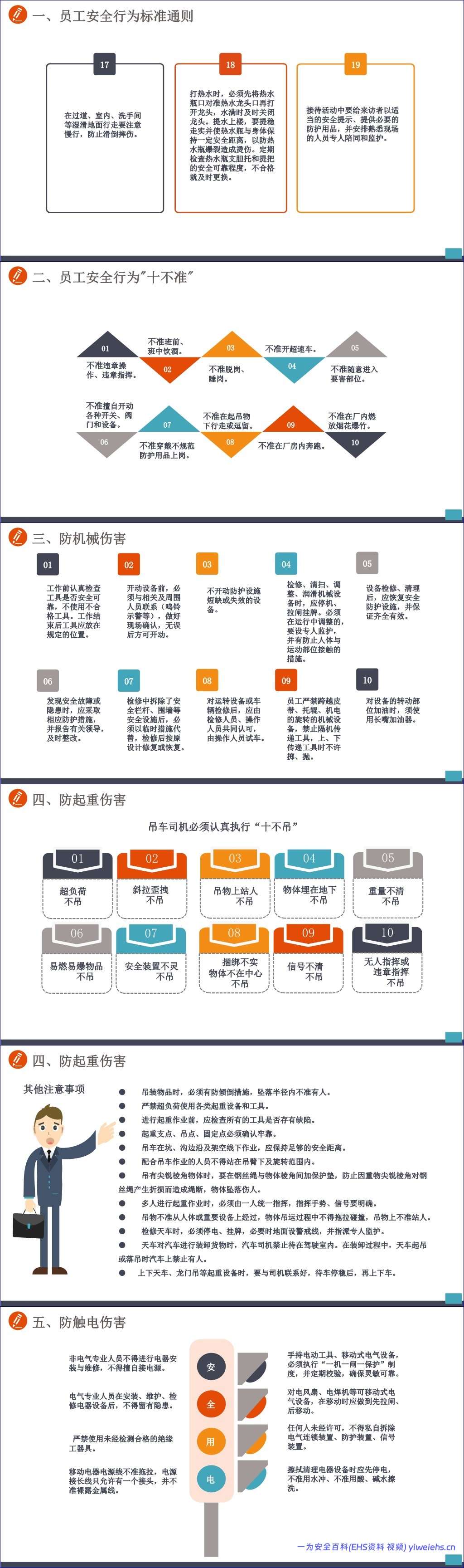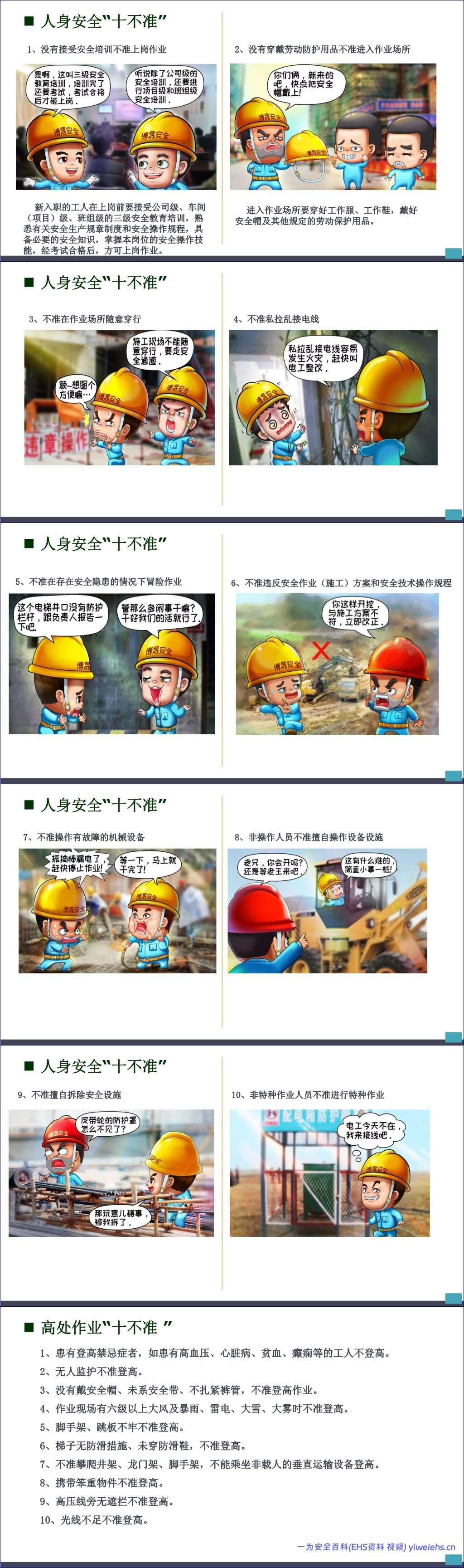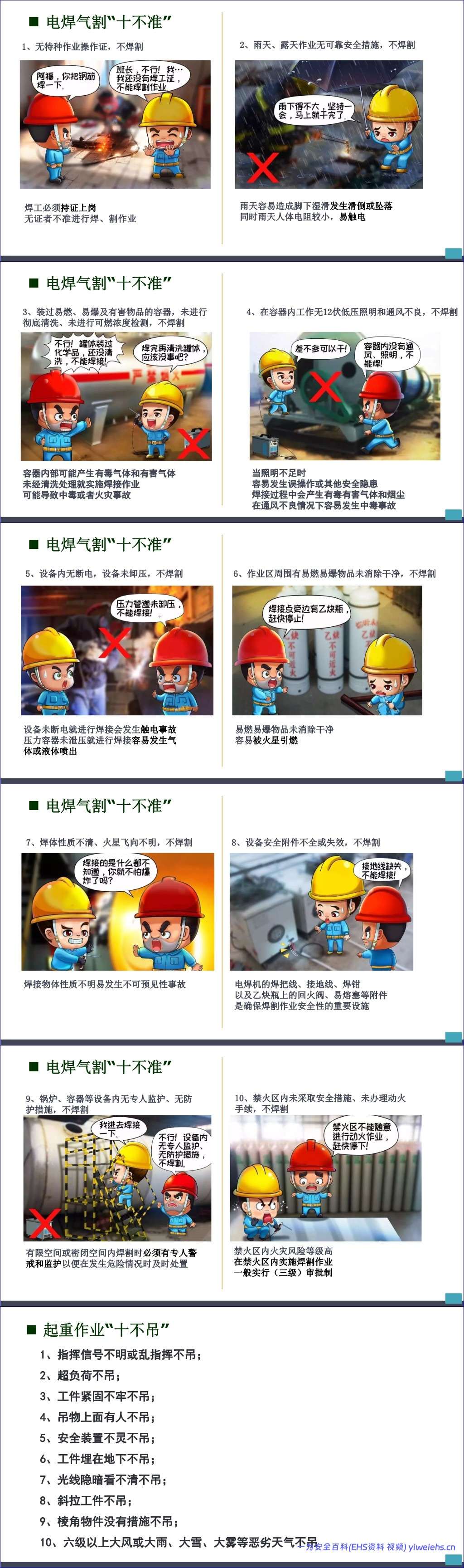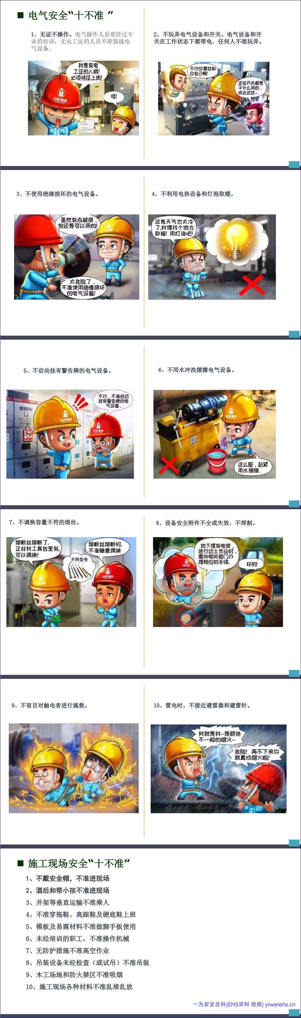 接着,手册通过多个“十不准”清单,如员工安全行为“十不准”、电焊气割“十不准”、起重作业“十不准”、电气安全“十不准”、施工现场安全“十不准”、人身安全“十不准”和高处作业“十不准”,以简洁明了的方式明确了各类作业场景下的绝对禁止行为,为员工划定了清晰的安全红线。