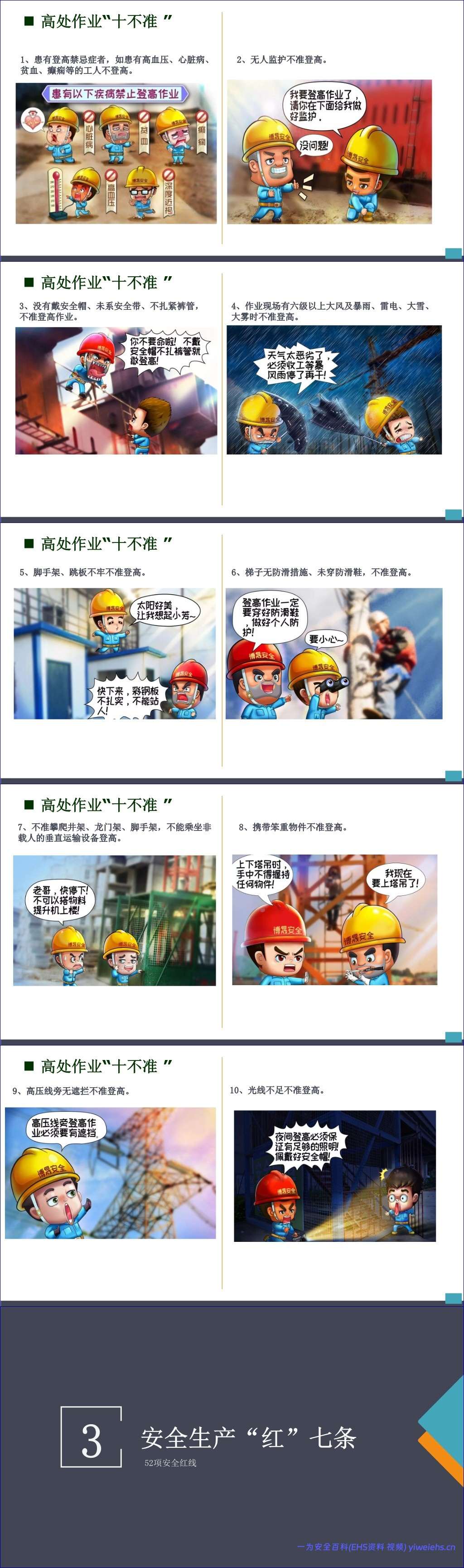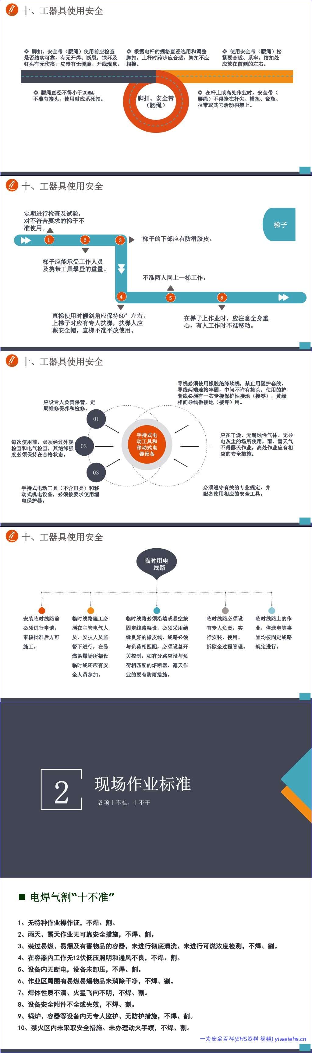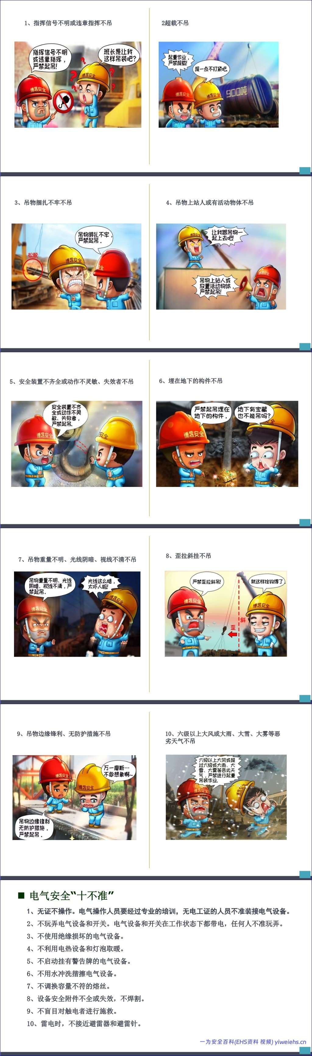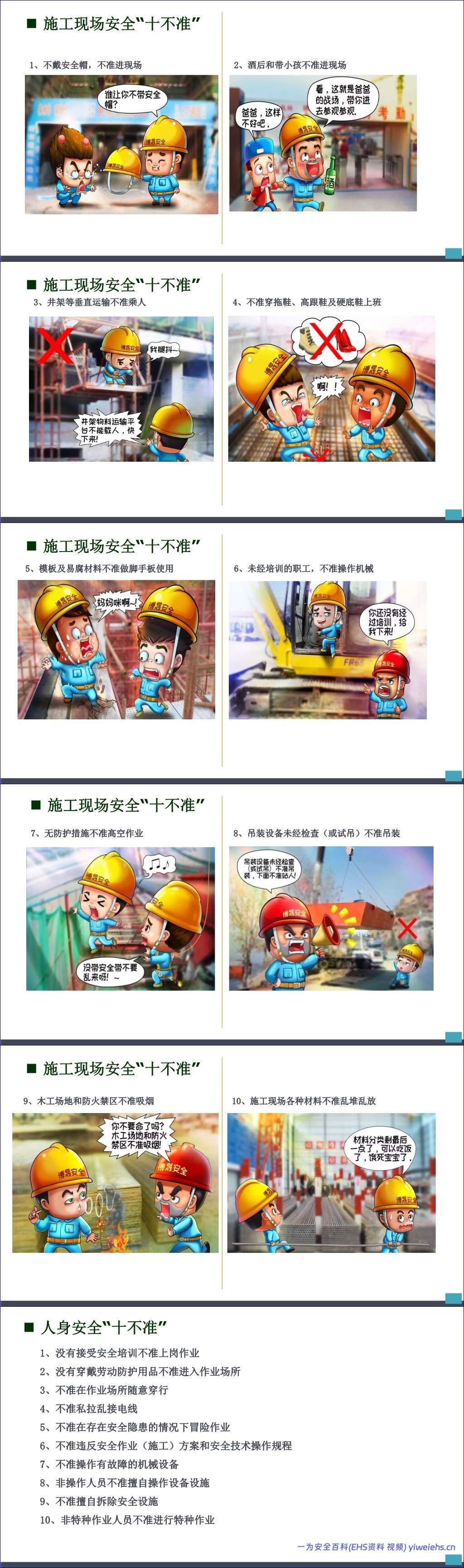 接着,手册通过多个“十不准”清单,如员工安全行为“十不准”、电焊气割“十不准”、起重作业“十不准”、电气安全“十不准”、施工现场安全“十不准”、人身安全“十不准”和高处作业“十不准”,以简洁明了的方式明确了各类作业场景下的绝对禁止行为,为员工划定了清晰的安全红线。