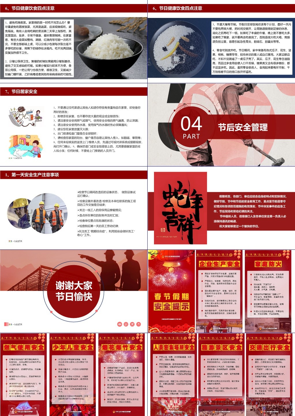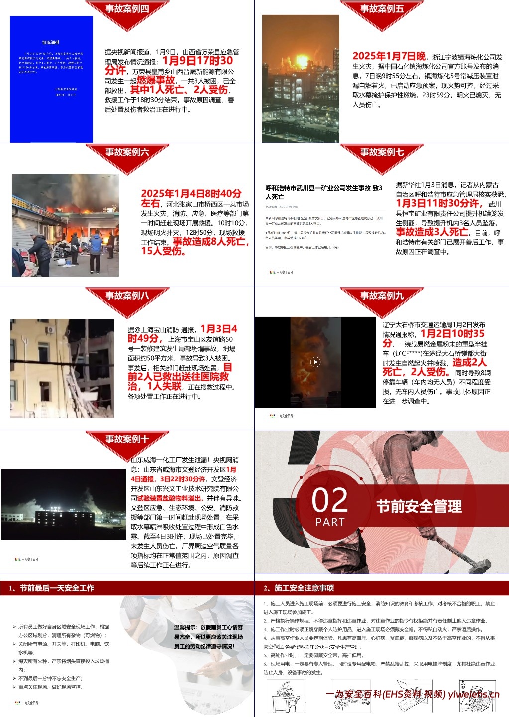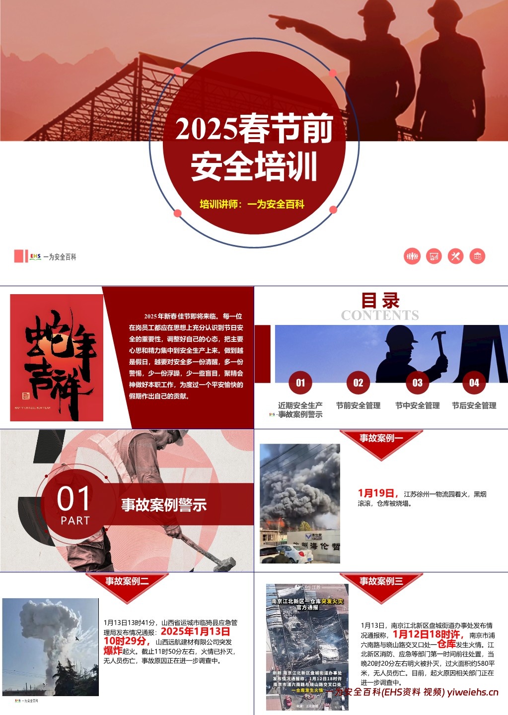 该文档是由 “一为安全百科” 提供讲师的 2025 春节前安全教育培训 PPT 内容,围绕春节前后安全生产与安全管理展开,旨在提升员工节日安全意识,降低安全事故风险,保障员工平安过节与企业节后顺利复工,同时还包含应急管理部针对不同场景的安全提示,内容全面且具有较强实操性。