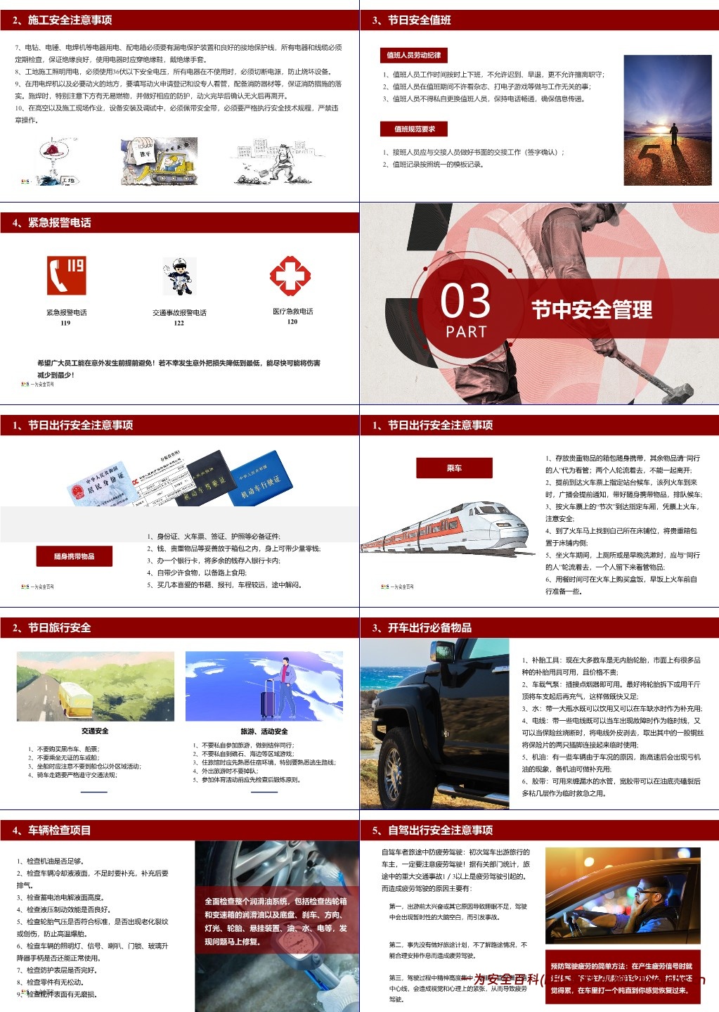 要求各部门、单位结合自身特点与实际情况,落实节前(遵章守纪与防范措施)、节中(突发事件应急)、节后(现场与劳动纪律)的安全教育与管理工作,明确节中值班人员、信息接口人及各单位安全第一负责人需保持通讯畅通,最后向员工送上节日祝福,祝愿大家度过愉快节日。