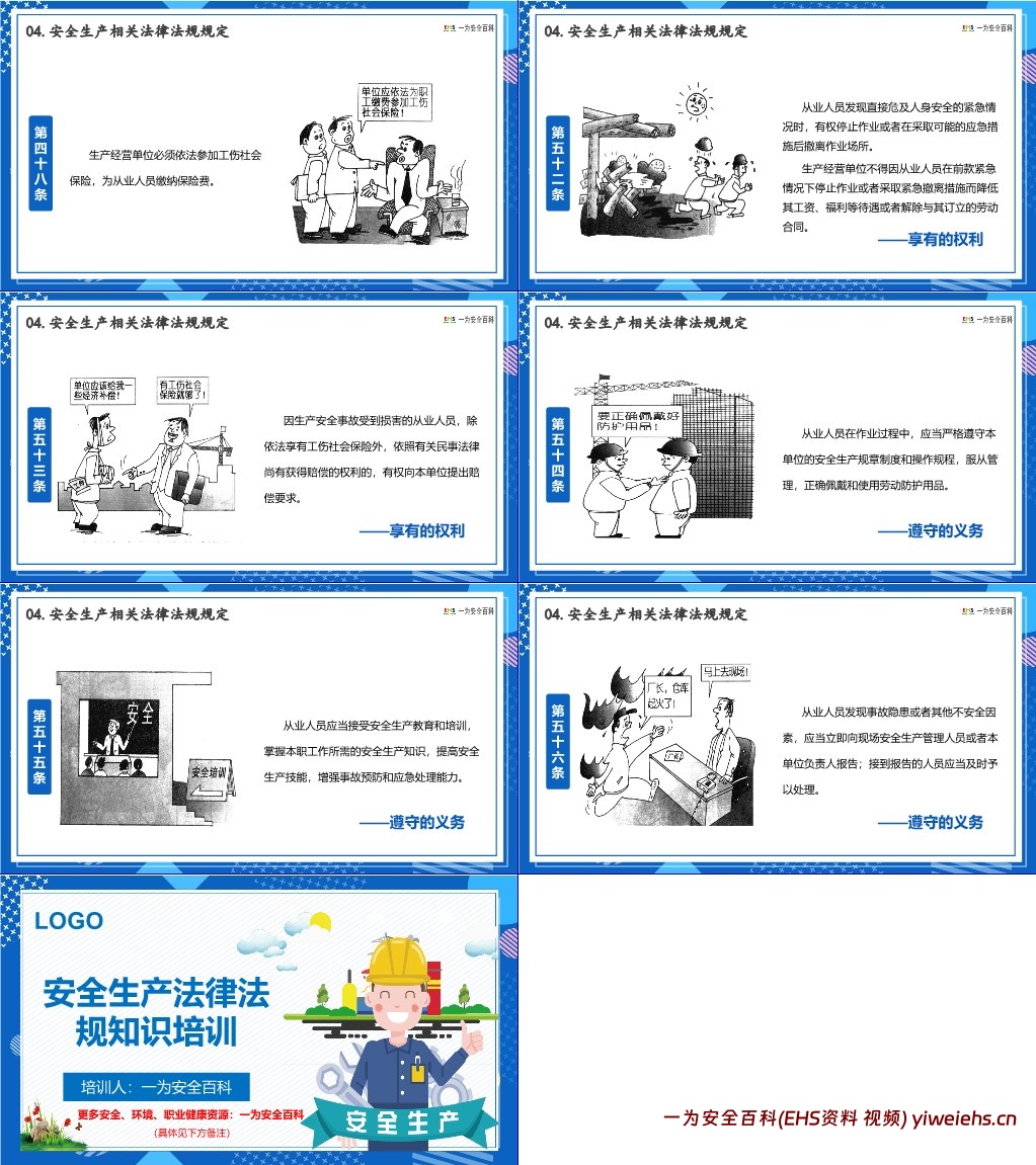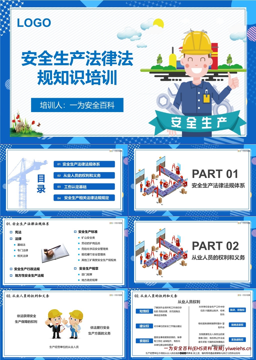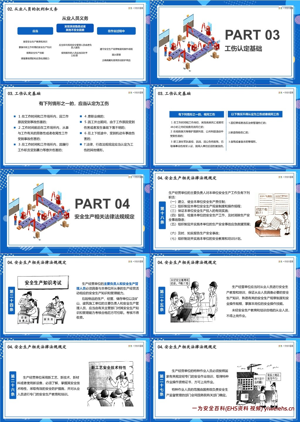 该文档是安全生产法律法规知识培训 PPT 内容,围绕安全生产相关核心知识展开,共分为四大板块,系统阐述了安全生产领域的法规体系、人员权利义务、工伤认定标准及具体法律规定,旨在提升生产经营单位及从业人员的安全生产意识与合规操作能力。