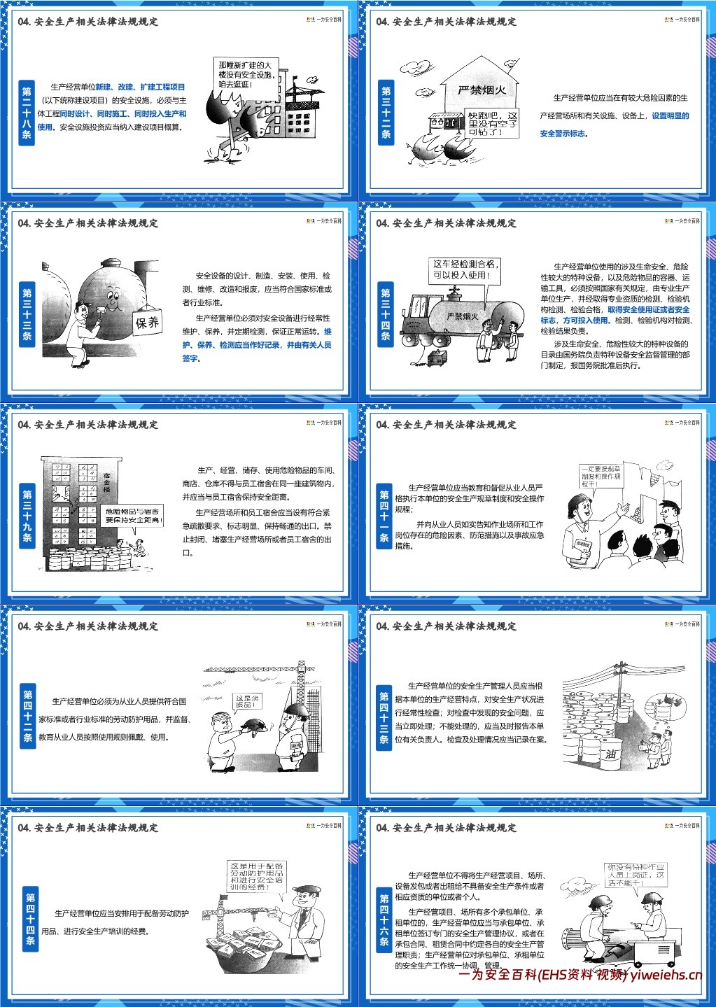 安全警示标志(第三十二条):生产经营单位应在有较大危险因素的生产经营场所和有关设施、设备上,设置明显的安全警示标志,提醒人员注意安全风险。
