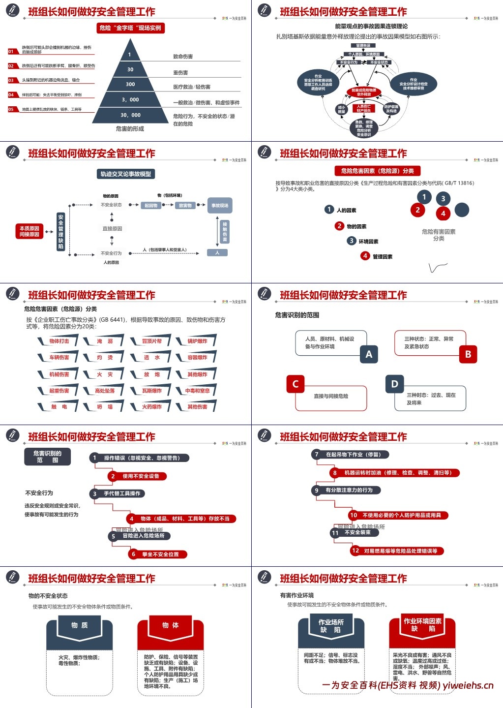 危险源辨识与控制:介绍多种事故致因理论,如事故因果型(连锁型、多因致果型、复合型)、多米诺骨牌理论(海因里希因果链锁论)、海因里希安全法则(300 个安全隐患可能引发 29 起惊吓事件和 1 起重大事故)、危害 “金字塔”(展示不同级别伤害与危险行为的数量关系)、能量观点的事故因果连锁理论、轨迹交叉论事故模型等,为危险源辨识提供理论支撑;明确危险源分类(按直接原因分 4 大类,按伤亡事故分 20 类)、危害识别范围(人员、设备等,正常 / 异常 / 紧急状态,直接 / 间接危险,过去 / 现在 / 将来时态)、不安全行为与状态(列举 12 类不安全行为、物的不安全状态、有害作业环境、安全管理缺陷),并给出危害识别思路(从危害、受伤害对象、伤害发生方式切入)。