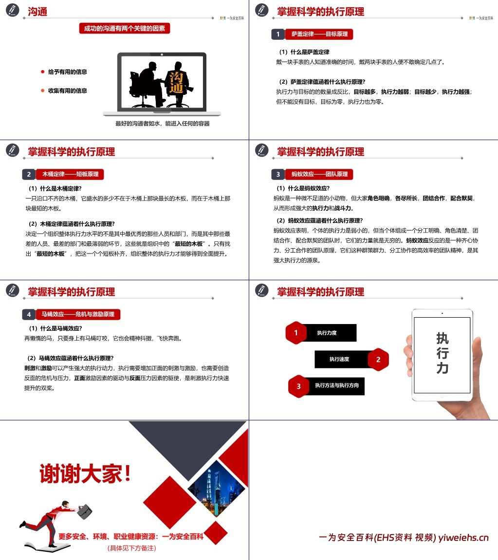 马蝇效应(危机与激励原理):马因马蝇叮咬而快速奔跑,说明正面激励与反面危机压力能刺激执行动力,班组长可通过奖励安全表现优秀者、指出安全隐患与后果等方式,双管齐下提升班组安全执行力。同时,执行力还需关注执行速度、执行方法与方向、执行力度三方面,确保安全工作高效推进。