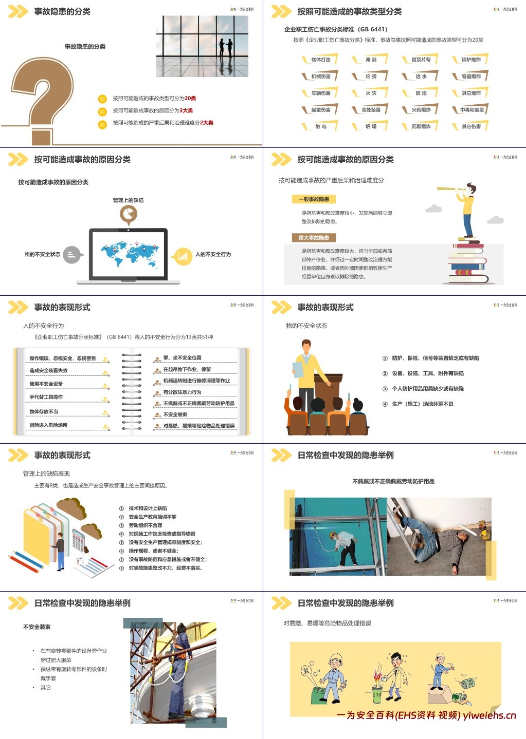 人的不安全行为:依据《企业职工伤亡事故分类标准》(GB 6441),分为 13 类共 51 种,如操作错误忽视安全与警告、造成安全装置失效、使用不安全设备、手代替工具操作、物体存放不当、攀坐不安全位置、在起吊物下作业停留、机器运转时维修清理、有分散注意力行为、不按规定佩戴劳动防护用品、冒险进入危险场所、不安全装束、对易燃易爆等危险物品处理错误等。
