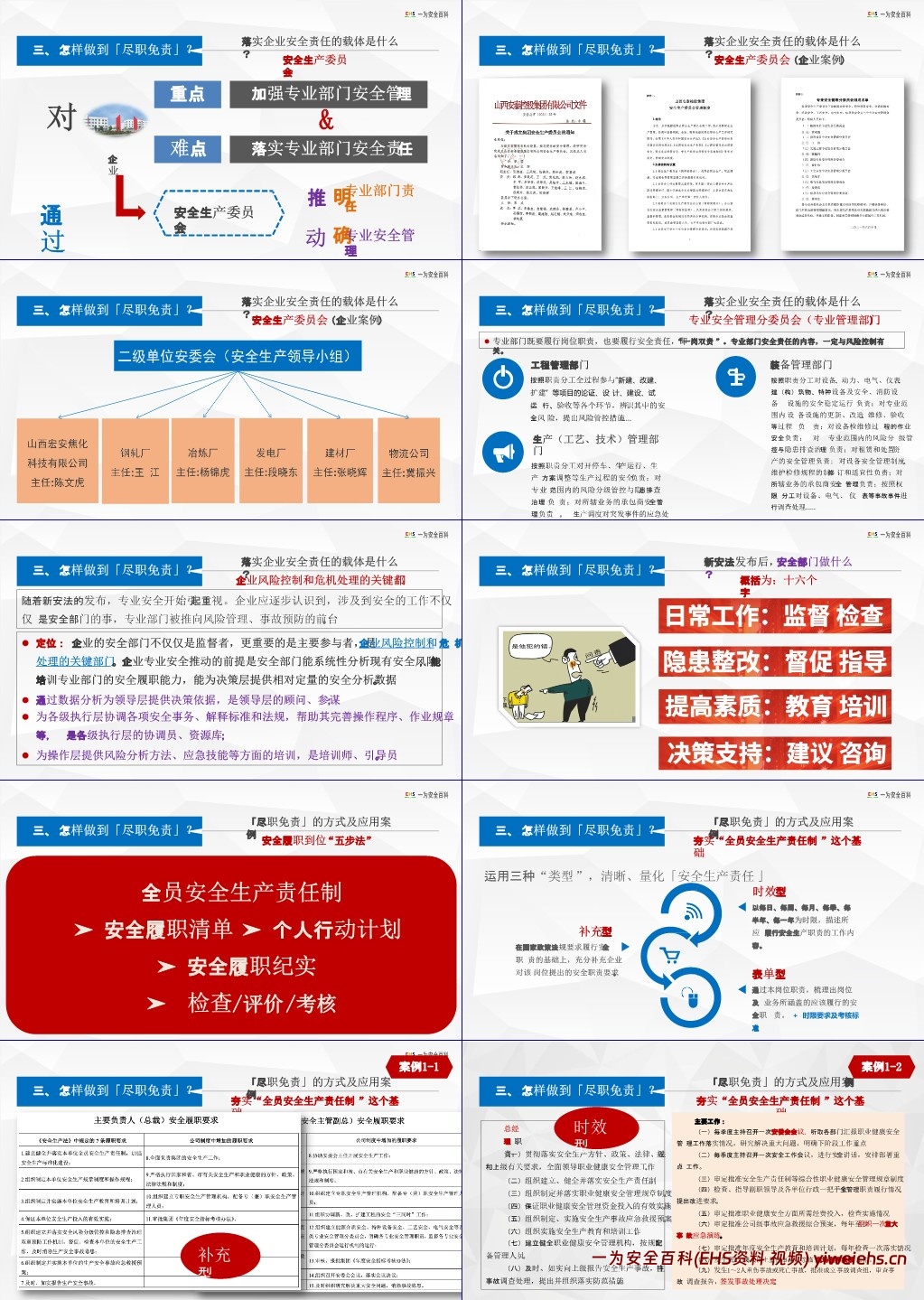 夯实全员安全生产责任制:运用时效型(按不同时限描述安全职责工作内容)、表单型(梳理岗位业务安全职责,明确时限要求与考核标准)、补充型(在法规要求基础上补充企业对岗位的安全职责要求)三种类型,清晰、量化安全生产责任。并给出总经理职责相关案例,分别体现补充型、时效型、表单型责任划分。