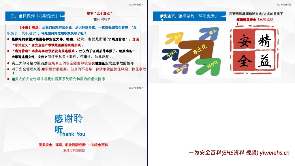 文档提出对 “痕迹管理” 的看法,认为其虽能证明工作开展,但与事故预防无直接联系,过度注重可能导致员工精力分散、忽视现场安全隐患,增加事故概率,避责式安全管理需系统研究根治。在此前提下,新安法下做到 “尽职免责” 需遵循精益安全 “六项原则”。