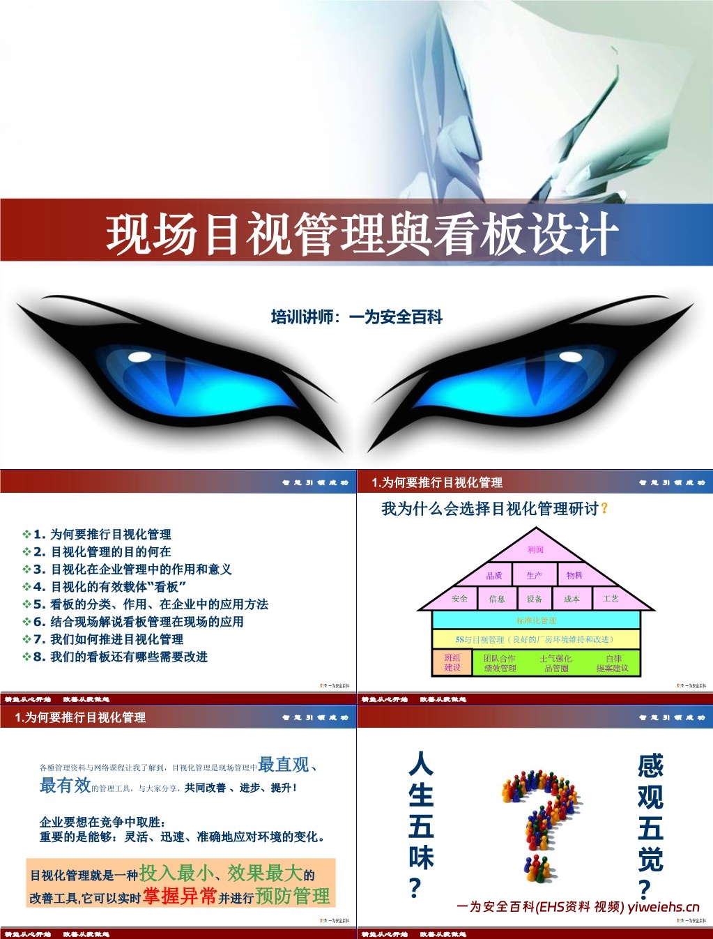 该文档是一份关于 “现场目视化及班组看板设计” 的培训 PPT 内容,围绕目视化管理与看板设计的核心逻辑,从推行原因、核心概念、工具应用到优化方向展开全面讲解,旨在帮助企业通过目视化管理提升现场管理效率,消除浪费、降低成本。