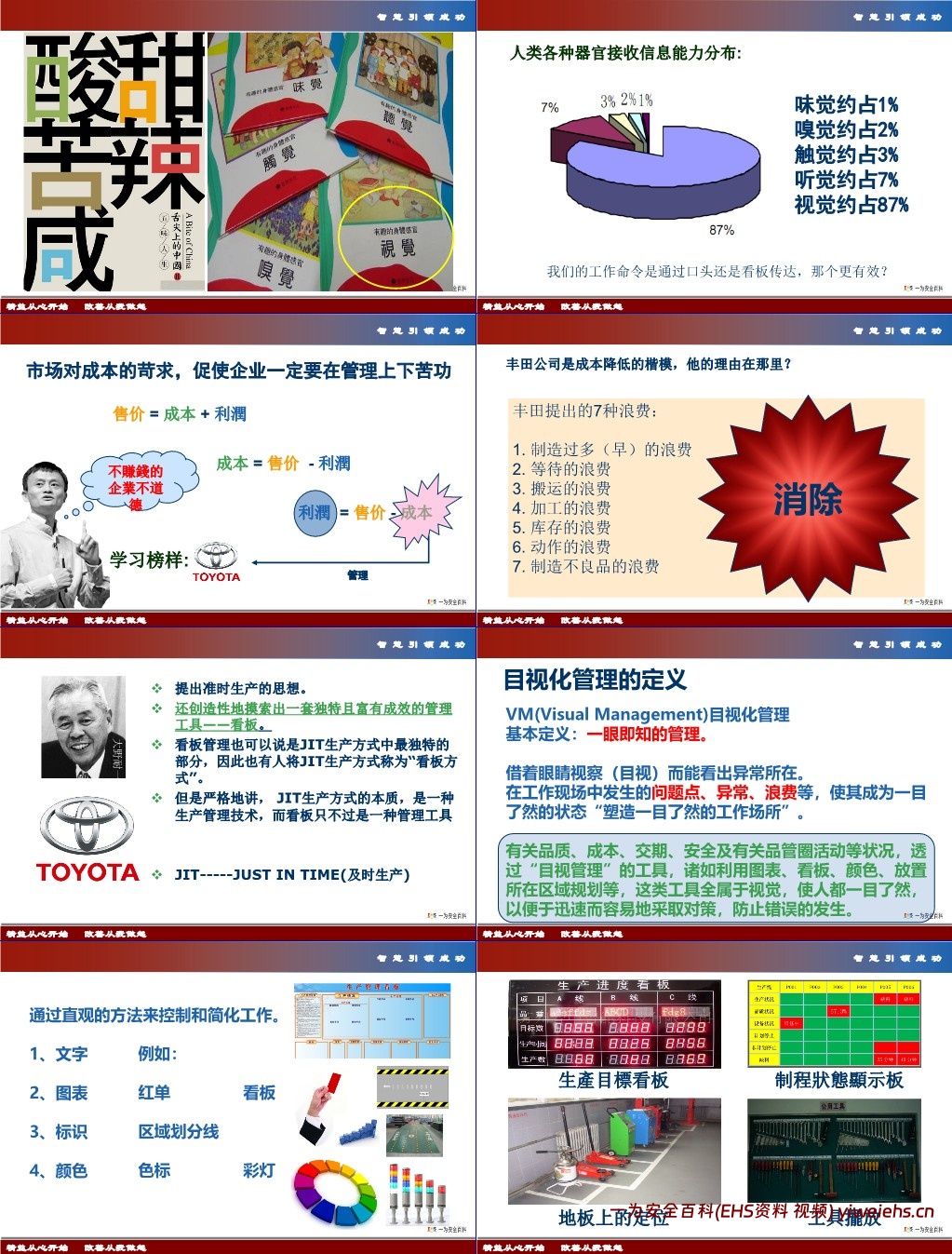 人类感官特性决定高效性:人类通过视觉接收的信息占比达 87%,远高于听觉(7%)、触觉(3%)、嗅觉(2%)和味觉(1%),基于视觉的目视化管理比口头传达更直观、高效,能减少信息传递误差。