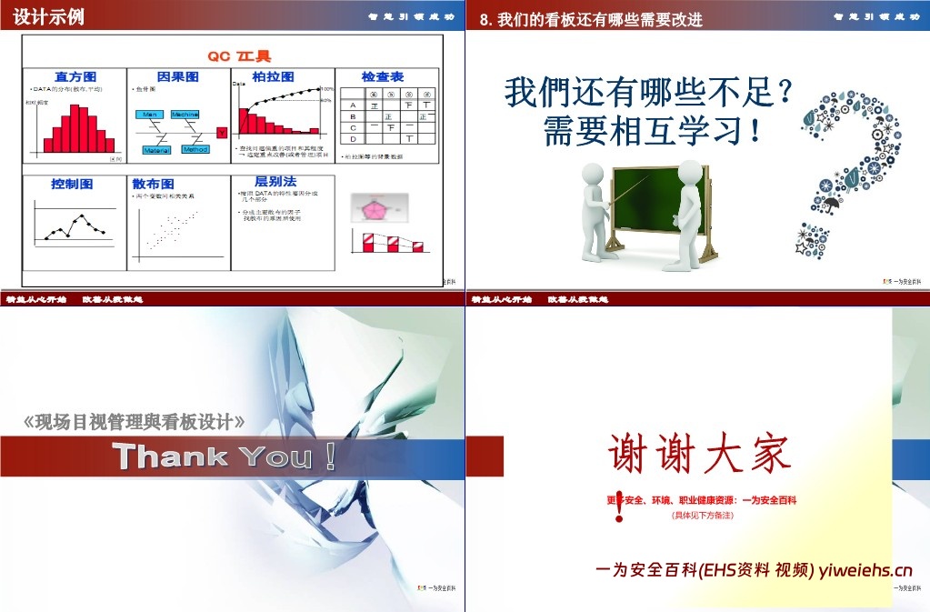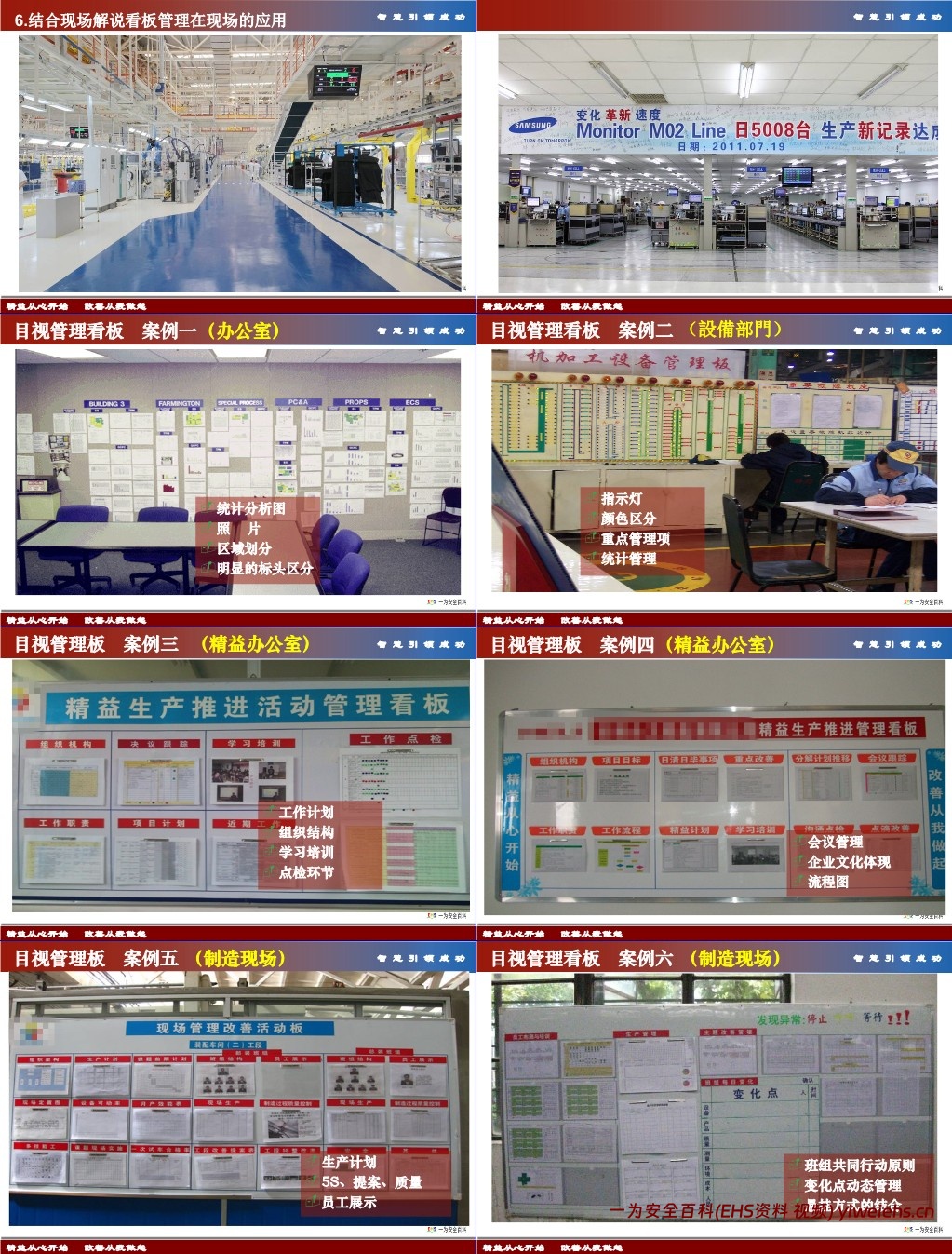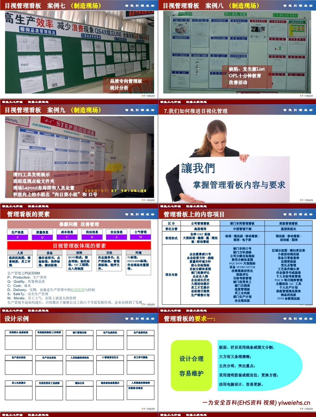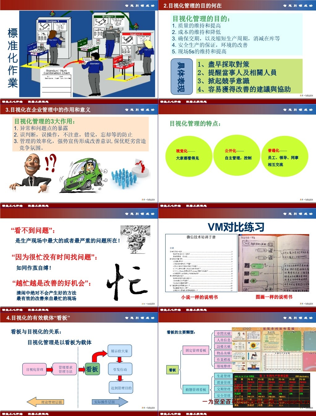 制造现场场景:聚焦生产计划、5S 评比、质量管控、员工技能培训、异常变化点管理(人、机、料、法、环),例如 “征服小组” 看板包含改善前后对比照片、缺陷清单、10 分钟教育记录等。