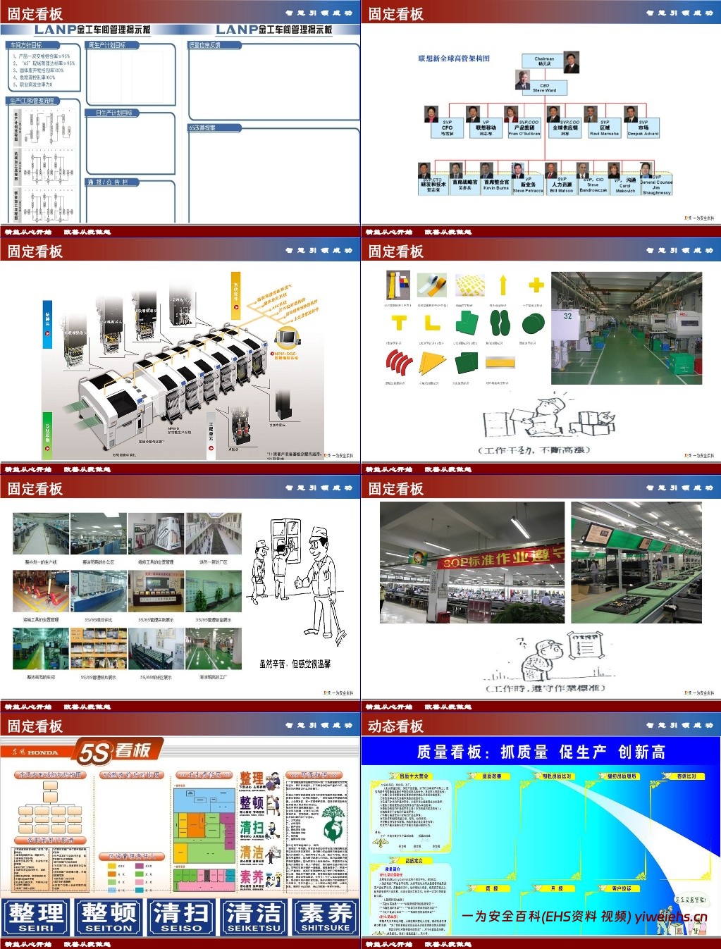 固定看板 长期稳定的管理信息,如车间名称、人员信息、设备名称、作业标准、组织结构、5S 责任区等 联想高管架构图、车间 5S 组织结构图、设备操作说明书、地面定位标识(脚印标、箭头标等)