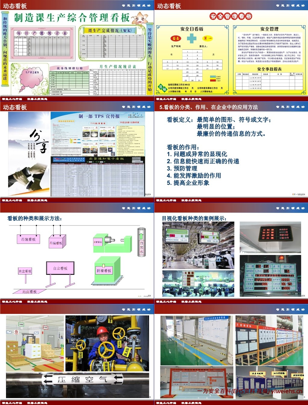 动态看板 实时变化的现场数据,如生产进度、质量状况、交期达成、安全事故、员工绩效等 车间生产管理看板(计划产量 / 实际产量 / 达成率)、质量看板(客诉比对 / 制程品质)、安全日看板(事故记录 / 无事故天数)
