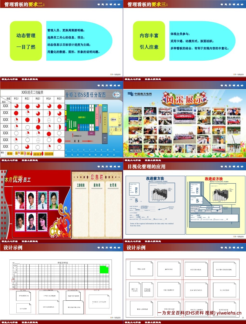 内容丰富,引人注意:体现全员参与(如员工风采展示、提案案例);采用卡通、动漫形式活跃版面;结合多种看板类型(固定 + 动态),丰富信息维度。
