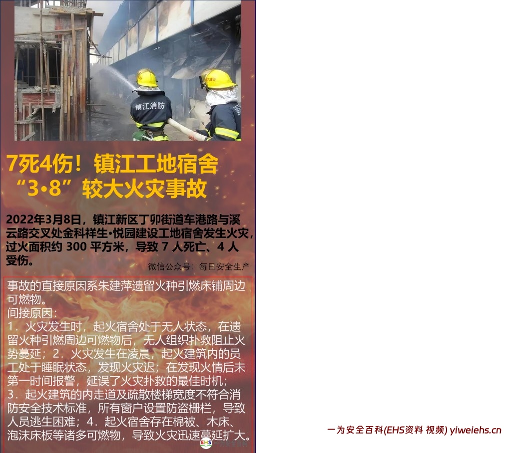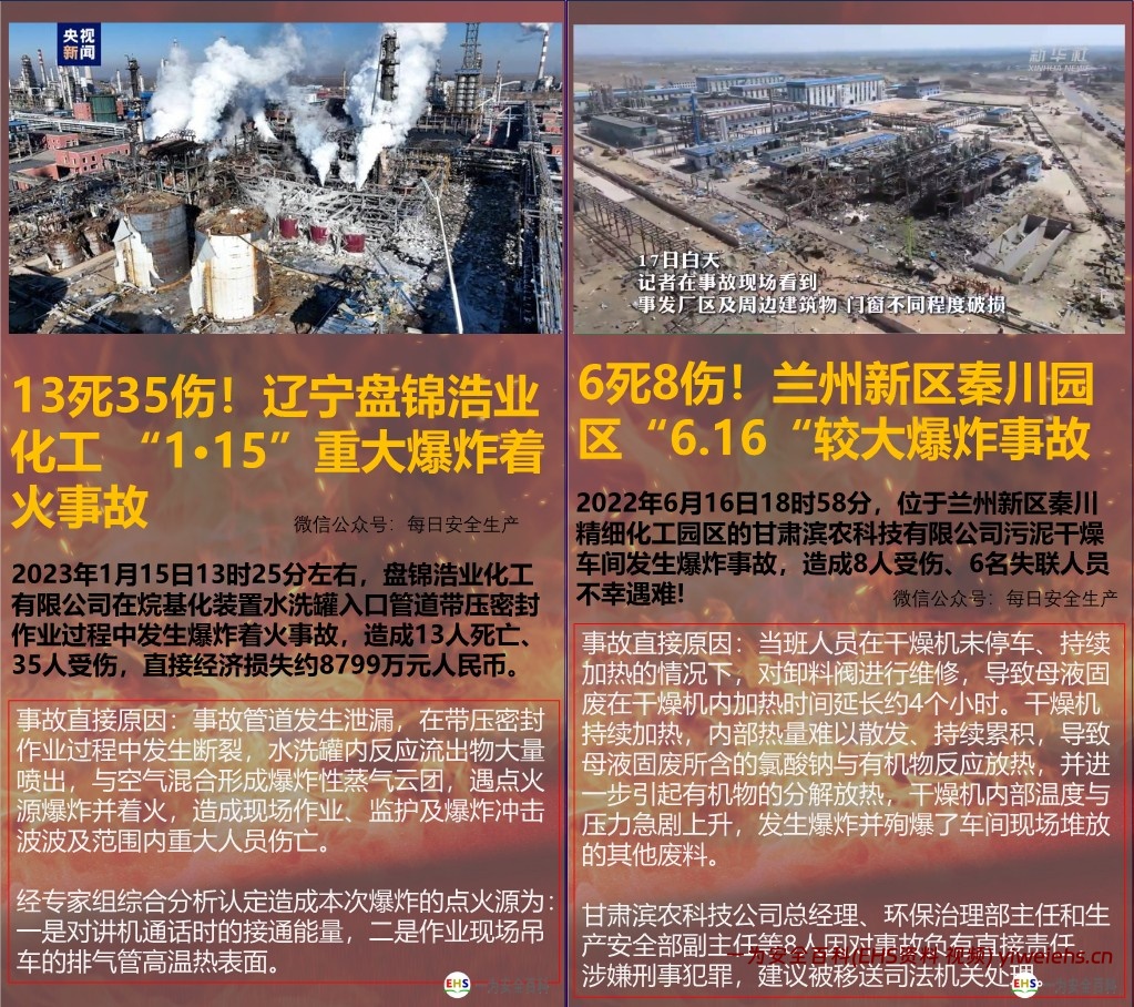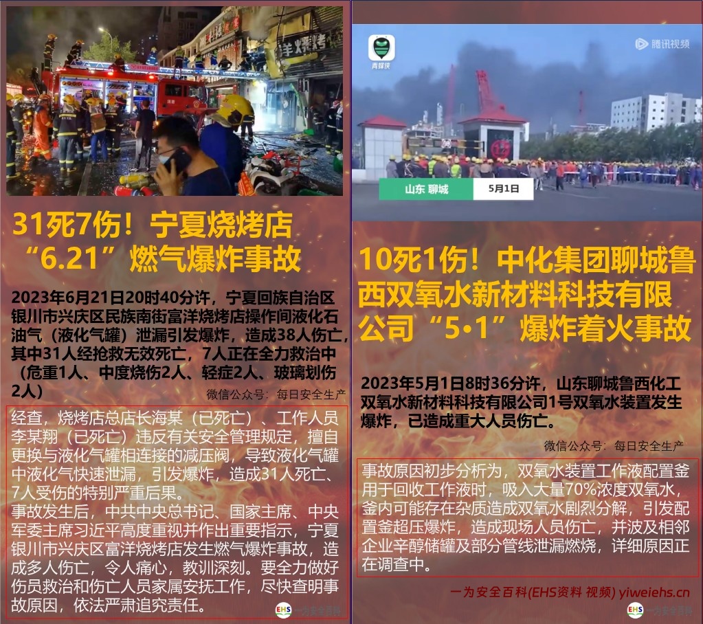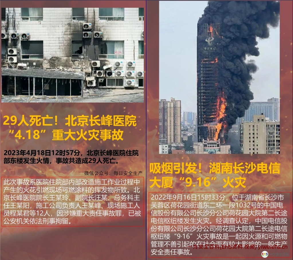 2022 年河南 “11・21” 特别重大火灾事故,因违法违规电焊作业引燃物品,消防设施缺失或失效致 42 死 2 伤;2023 年浙江武义 “4・17” 重大火灾事故,由违法电焊施工引燃违规存放油漆,厂房安全条件不达标且未开展应急演练致 11 死;2023 年河北沧州废弃冷库火灾事故,疑因拆除前未处理液氨泄漏,遇明火爆炸致 11 死;2023 年北京长峰医院 “4・18” 重大火灾事故,施工火花引燃可燃涂料挥发物致 29 死;2022 年湖南长沙电信大厦 “9・16” 火灾,因火源和可燃物管理不善,由吸烟引发;2023 年宁夏银川 “6・21” 燃气爆炸事故,因擅自更换液化气罐减压阀致泄漏爆炸,31 死 7 伤;2023 年山东聊城鲁西化工 “5・1” 爆炸着火事故,双氧水装置配置釜吸入高浓度双氧水,杂质致其剧烈分解爆炸;2023 年辽宁盘锦浩业化工 “1・15” 重大爆炸着火事故,管道泄漏带压密封作业时断裂,物料喷出形成爆炸性蒸气云团遇火源爆炸,13 死 35 伤;2022 年甘肃兰州新区 “6・16” 较大爆炸事故,干燥机未停车维修致内部热量累积,引发物料反应爆炸,6 死 8 伤;2022 年江苏镇江工地宿舍 “3・8” 较大火灾事故,因遗留火种引燃可燃物,宿舍逃生条件差致 7 死 4 伤。每个案例均分析直接原因、间接原因及相关责任处理情况。