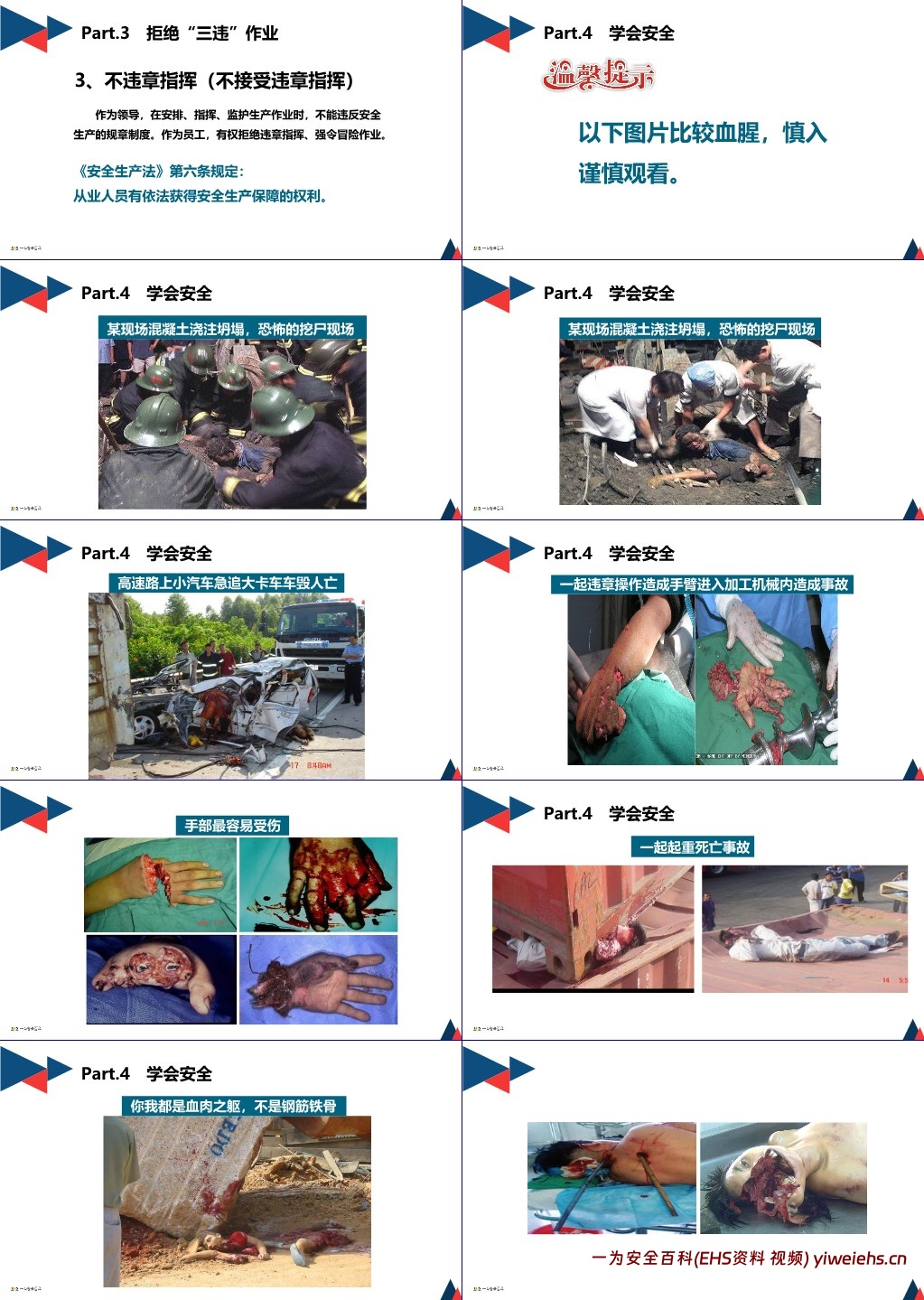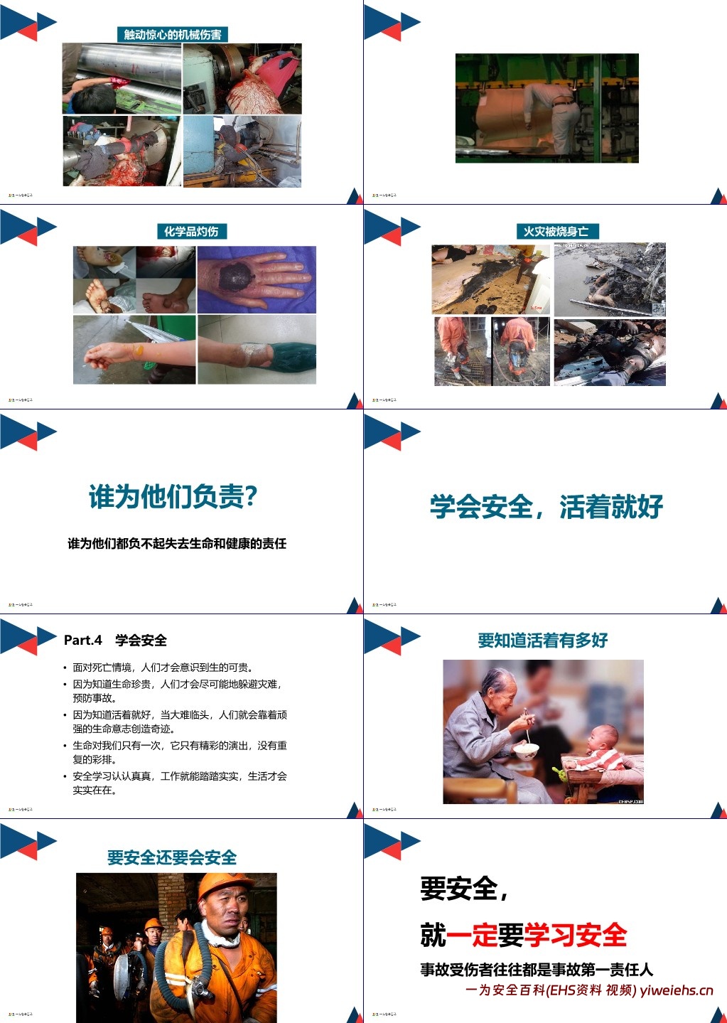 事故的警示意义:文档展示了混凝土浇注坍塌、机械伤害、化学品灼伤、火灾等事故现场图片,强调 “学会安全,活着就好”。生命只有一次,事故受伤者往往是自身安全的第一责任人,只有重视安全学习,才能踏实工作、安稳生活。