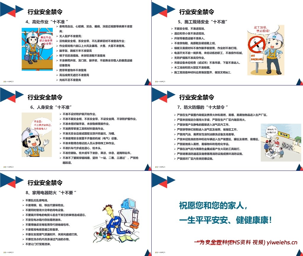 行业安全禁令:包括电焊气割 “十不准”、起重作业 “十不吊”、电气安全 “十不准”、高处作业 “十不准”、施工现场安全 “十不准”、人身安全 “十不准”、防火防爆 “十大禁令”、家用电器防火 “十不要”,明确各场景下的禁止性操作,规范员工作业行为。