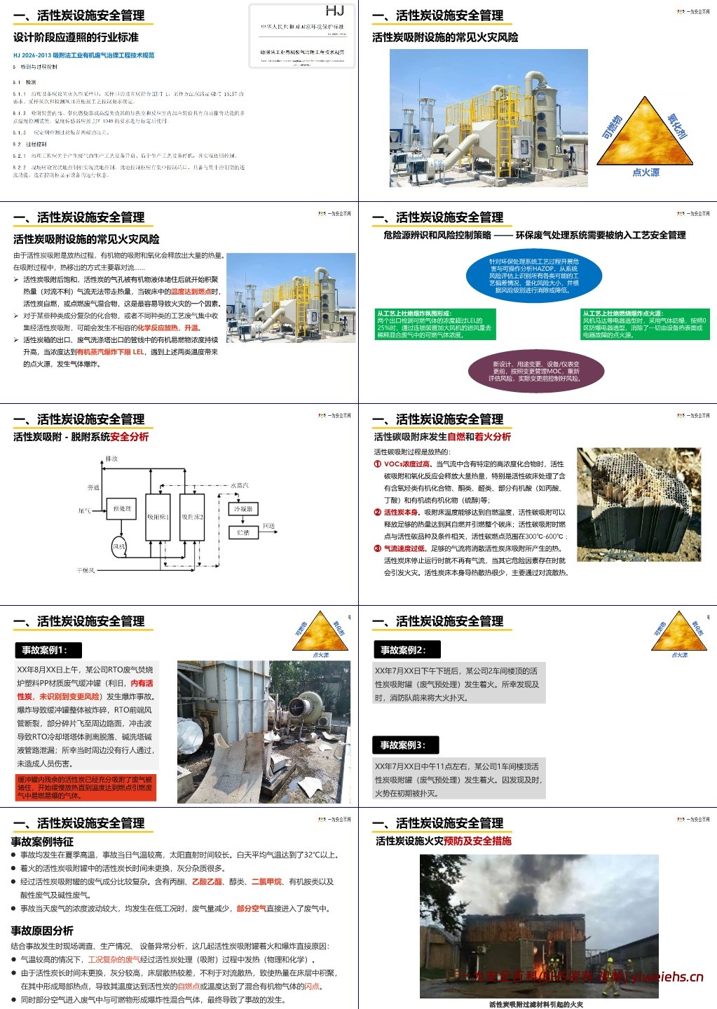- 主要风险:吸附放热导致热量积聚(活性炭饱和后气孔堵塞,对流散热失效,温度达燃点引发自燃);废气成分复杂引发不相容化学反应放热;可燃气体浓度达爆炸极限(LEL)遇点火源爆炸。