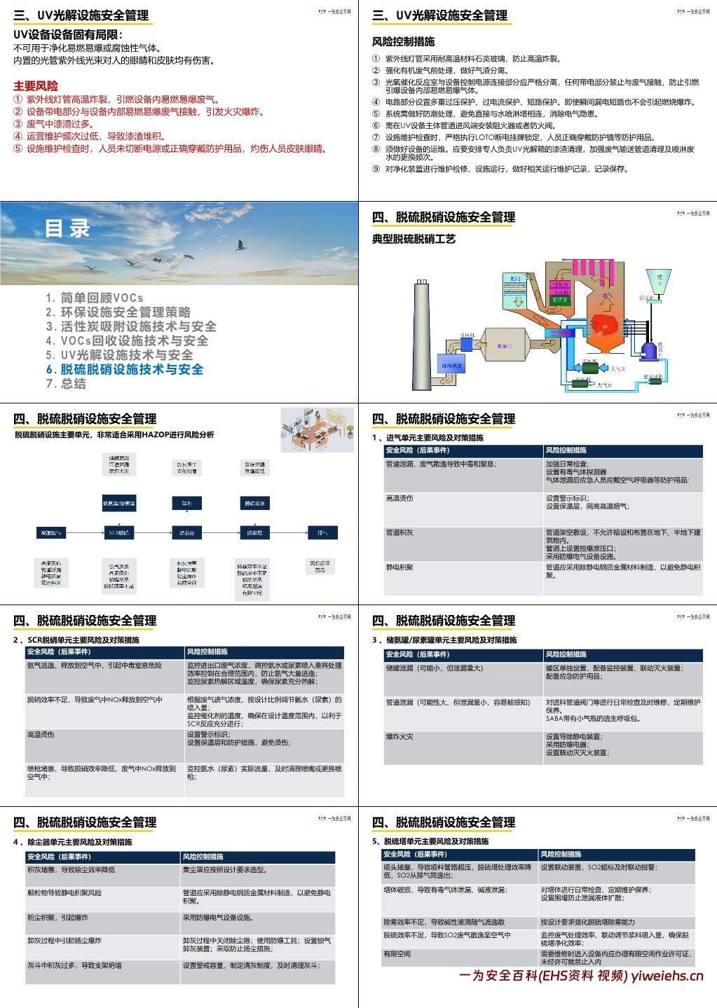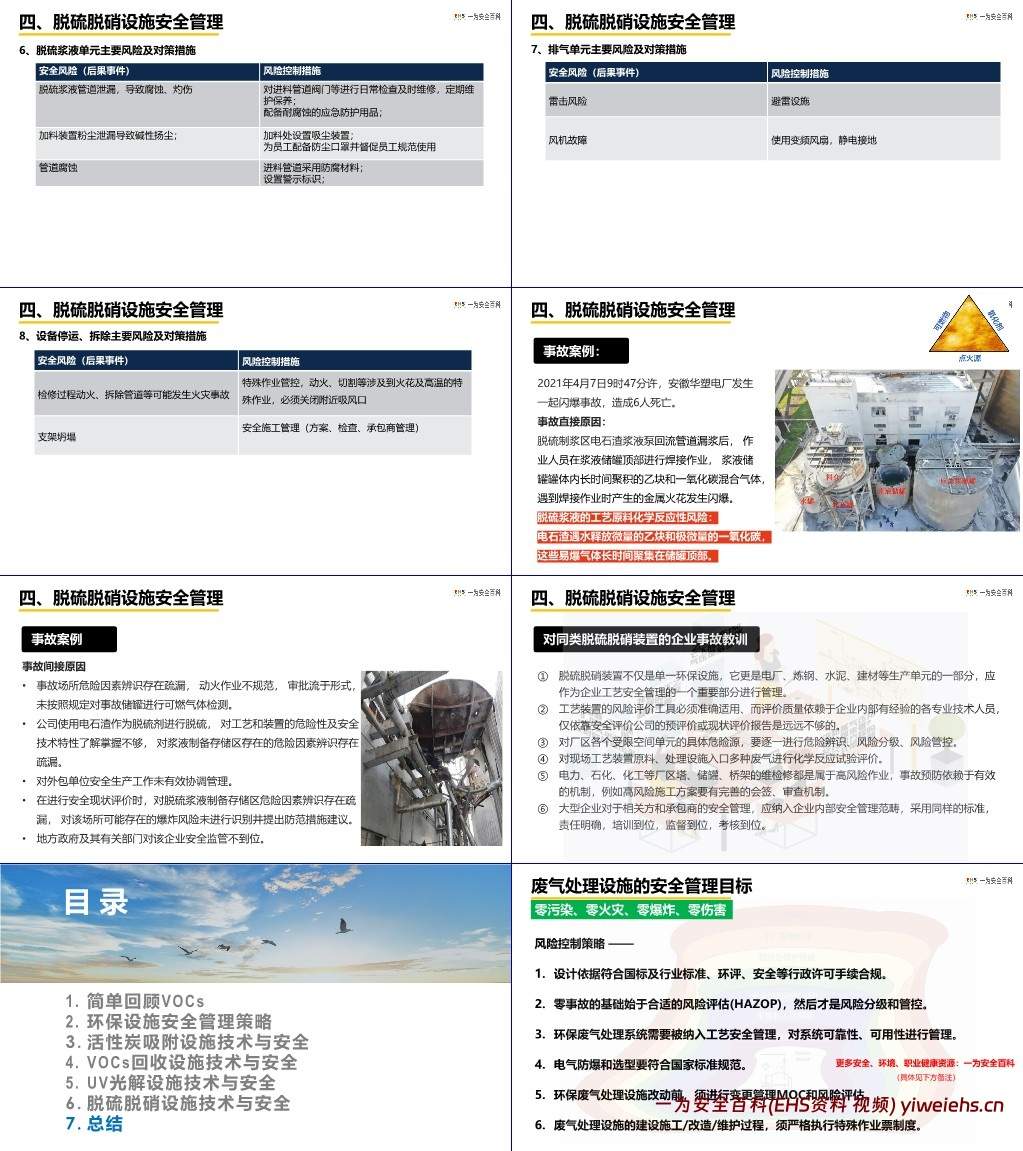该课件围绕环保设施安全技术管理展开,以 VOCs(挥发性有机化合物)相关治理设施及脱硫脱硝设施为核心,系统讲解了技术原理、安全风险及管理策略,旨在实现 “零污染、零火灾、零爆炸、零伤害” 的安全管理目标。
