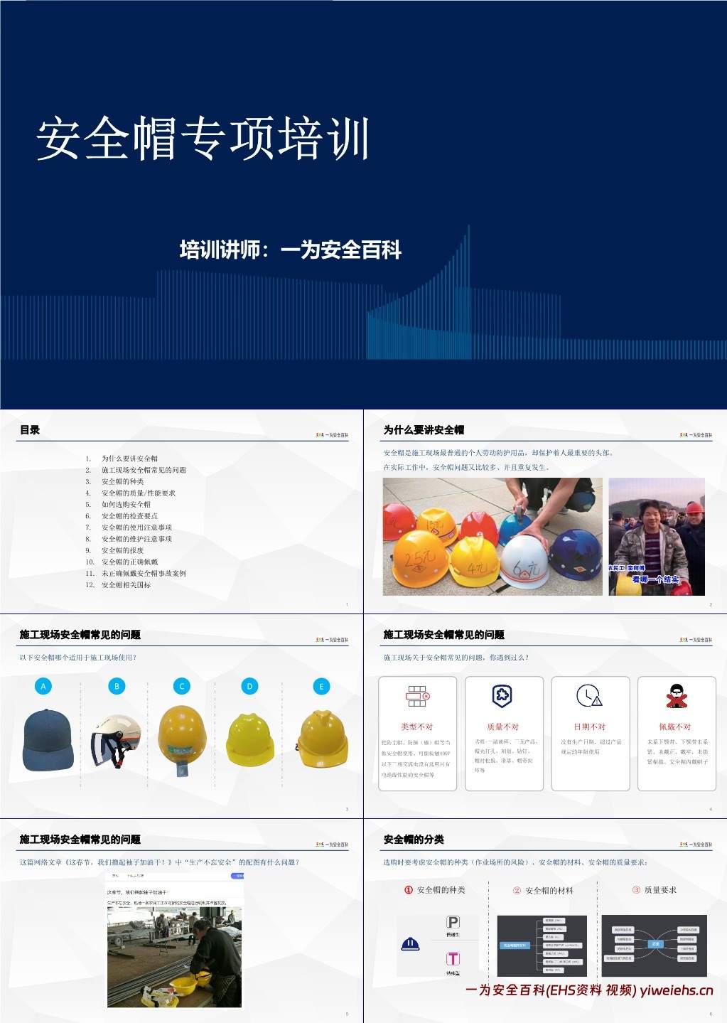 该文档是一份针对安全帽的专项培训 PPT 内容,围绕安全帽在施工现场等场景的相关知识展开全面讲解,旨在提升使用者对安全帽的认知与规范使用能力,具体内容如下:
