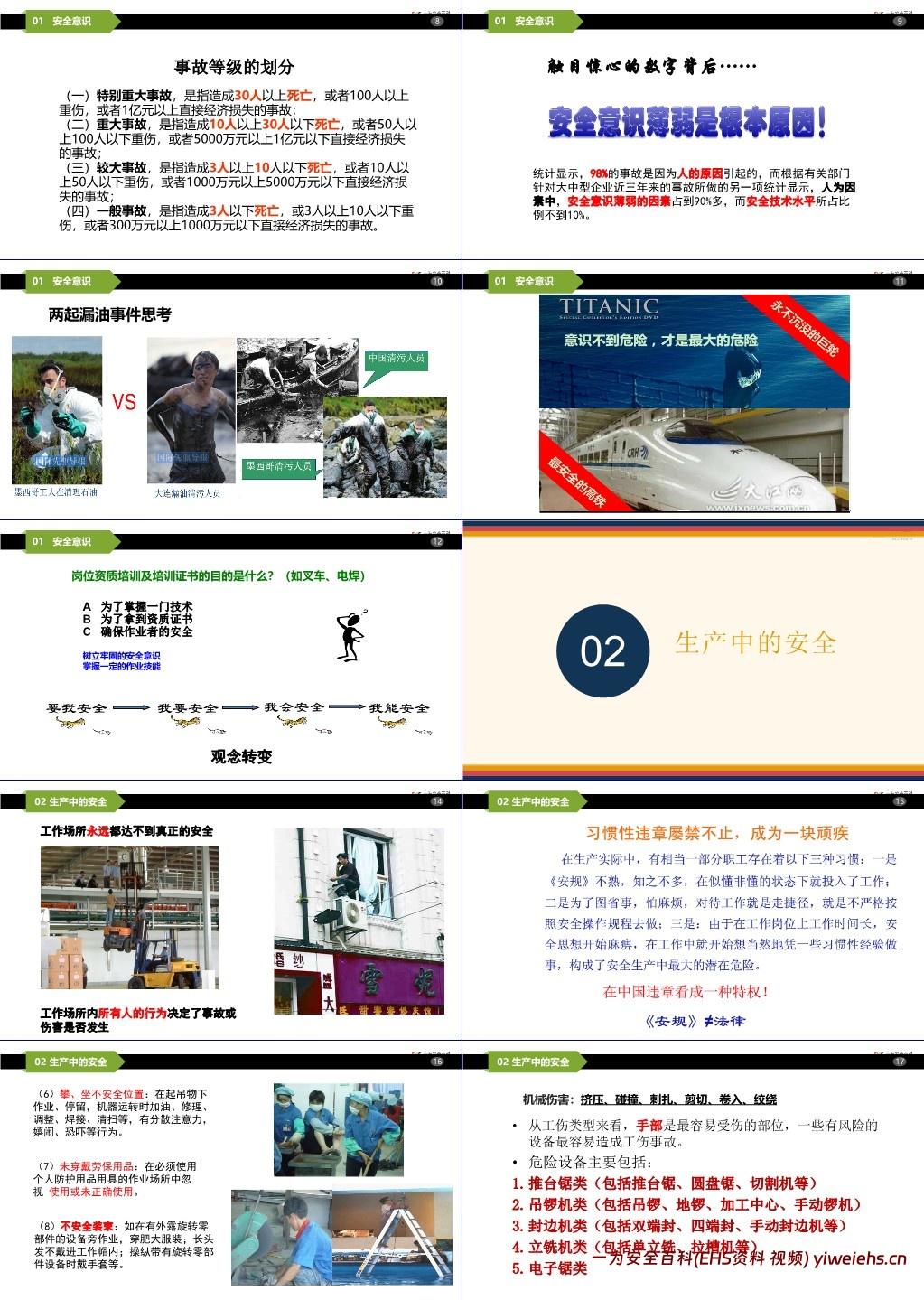 (四)安全意识转变方向 提出岗位资质培训(如叉车、电焊)的核心目的是 “确保作业者安全”,而非仅掌握技术或获取证书。倡导安全意识从 “要我安全” 向 “我要安全”“我会安全”“我能安全” 转变,要求人员既树立牢固安全意识,又掌握专业作业技能。 三、生产中的安全 (一)不安全行为表现与危害