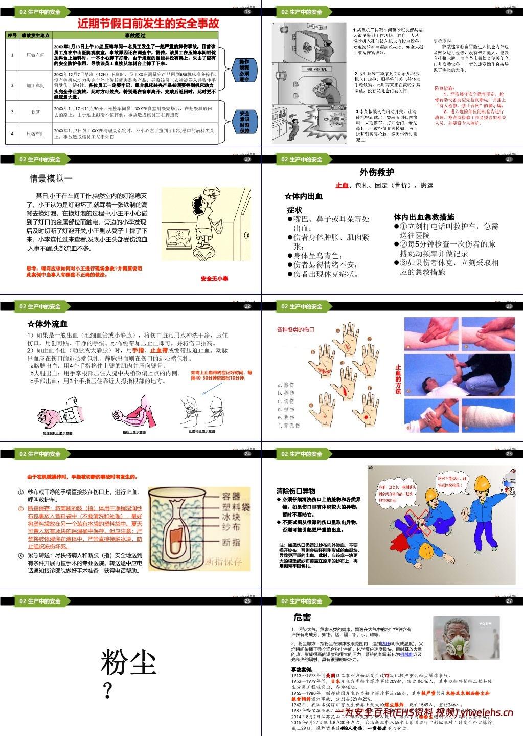 同时,还列举重机厂铸型车间碾砂机事故:班长薛某某违章独自进入机仓检修未告知他人、未挂警示牌,翻砂工李某未检查就关仓门启动设备,致薛某某死亡,强调 “操作规程必须遵守,安全意识时刻保持”。 (三)现场急救知识