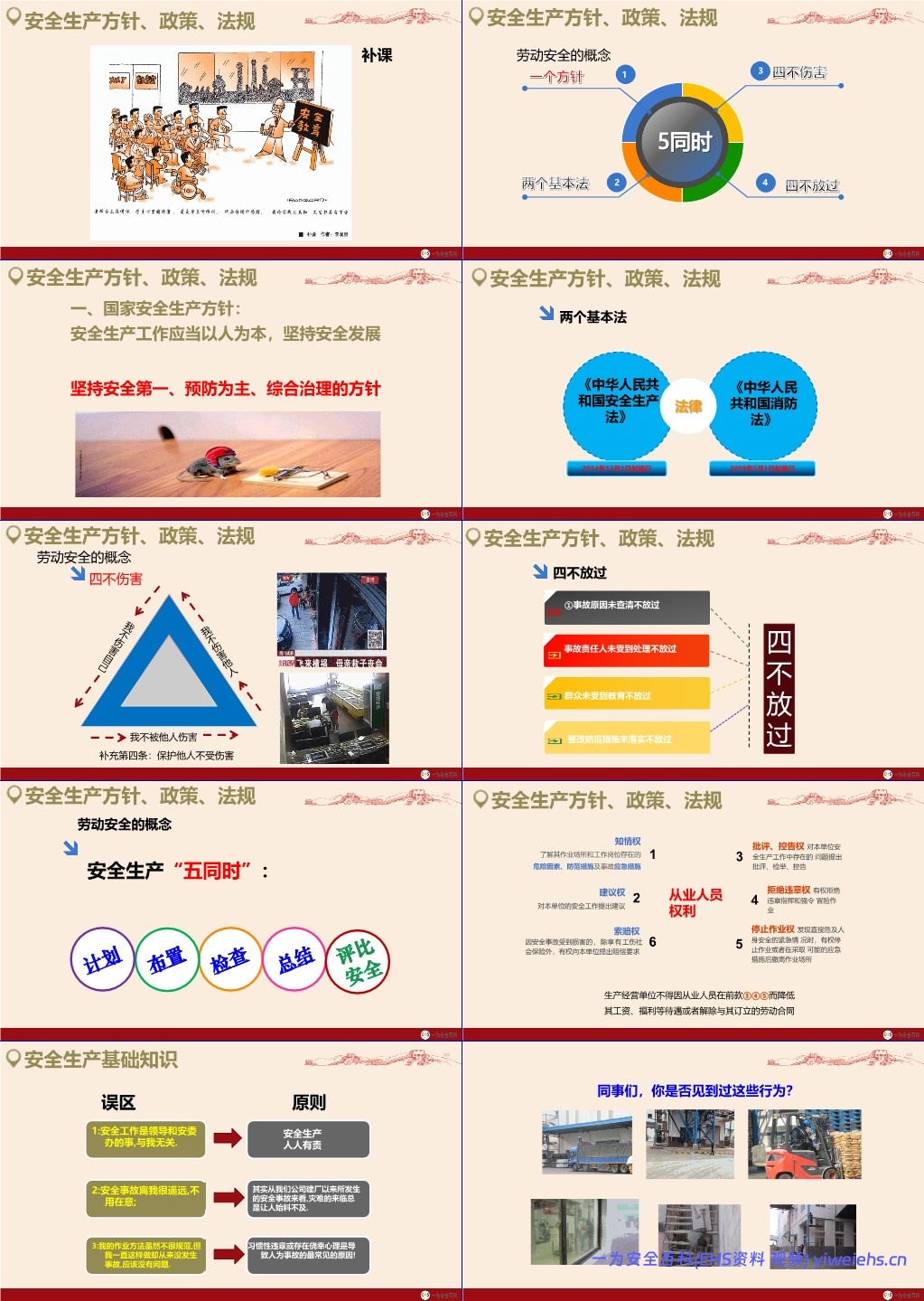 劳动安全关键概念:包含 “一个方针”(安全第一、预防为主、综合治理)、“两个基本法”(《安全生产法》《消防法》)、“四不伤害”(不伤害自己、不伤害他人、不被他人伤害、保护他人不受伤害)、“四不放过”(事故原因未查清、责任人未处理、群众未教育、整改措施未落实不放过)、“五同时”(计划、布置、检查、总结、评比安全工作同步进行)。